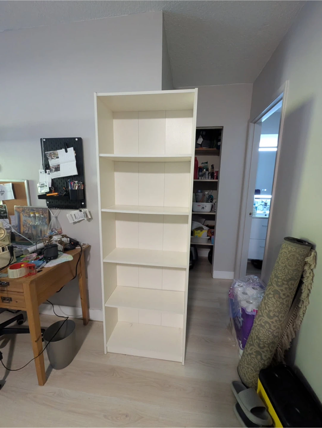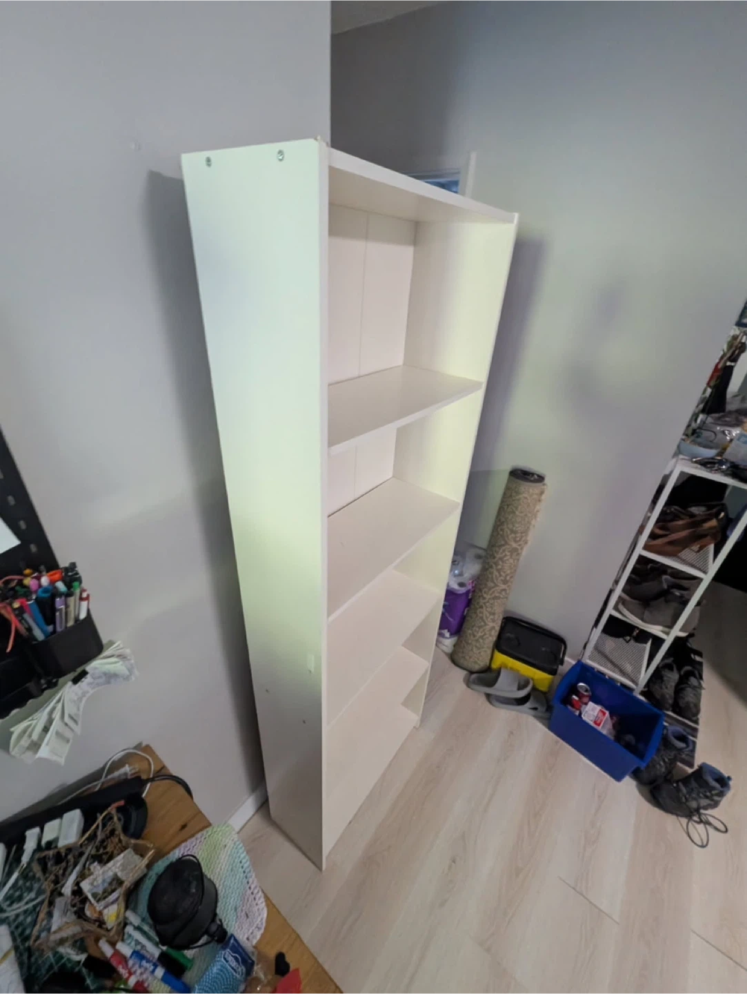 Good condition, some minor scratches. Now missing two of the pegs that hold the shelves (pocketed by a buyer that changed their mind mid-pick up)