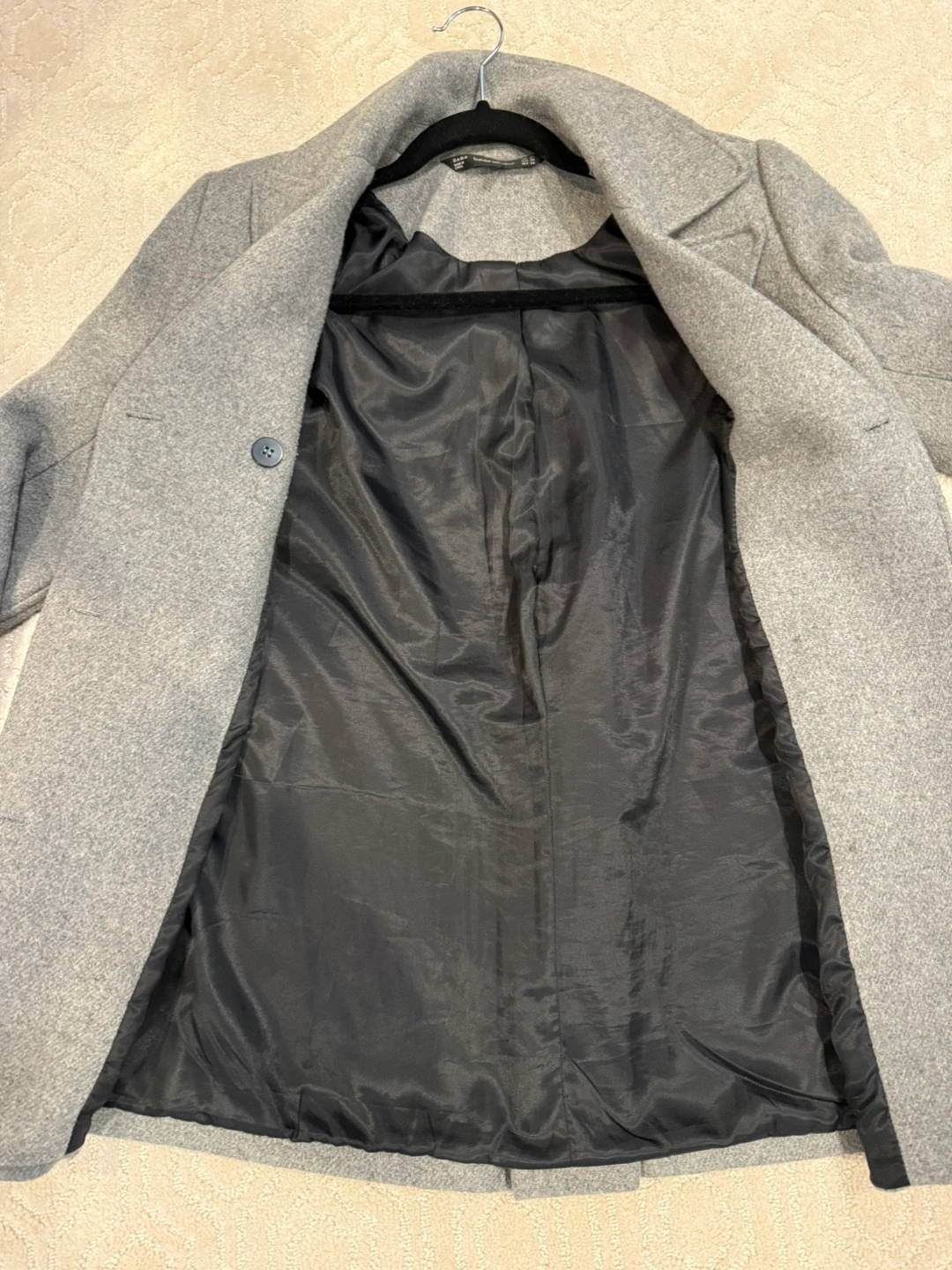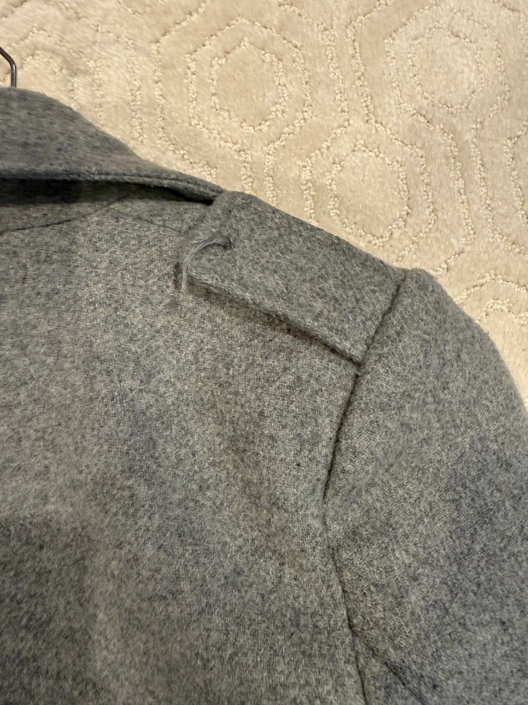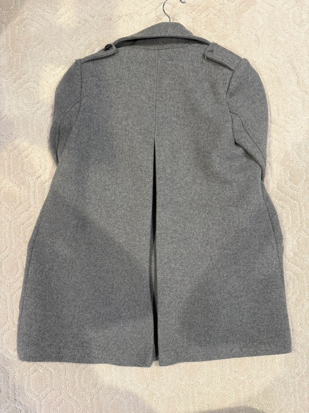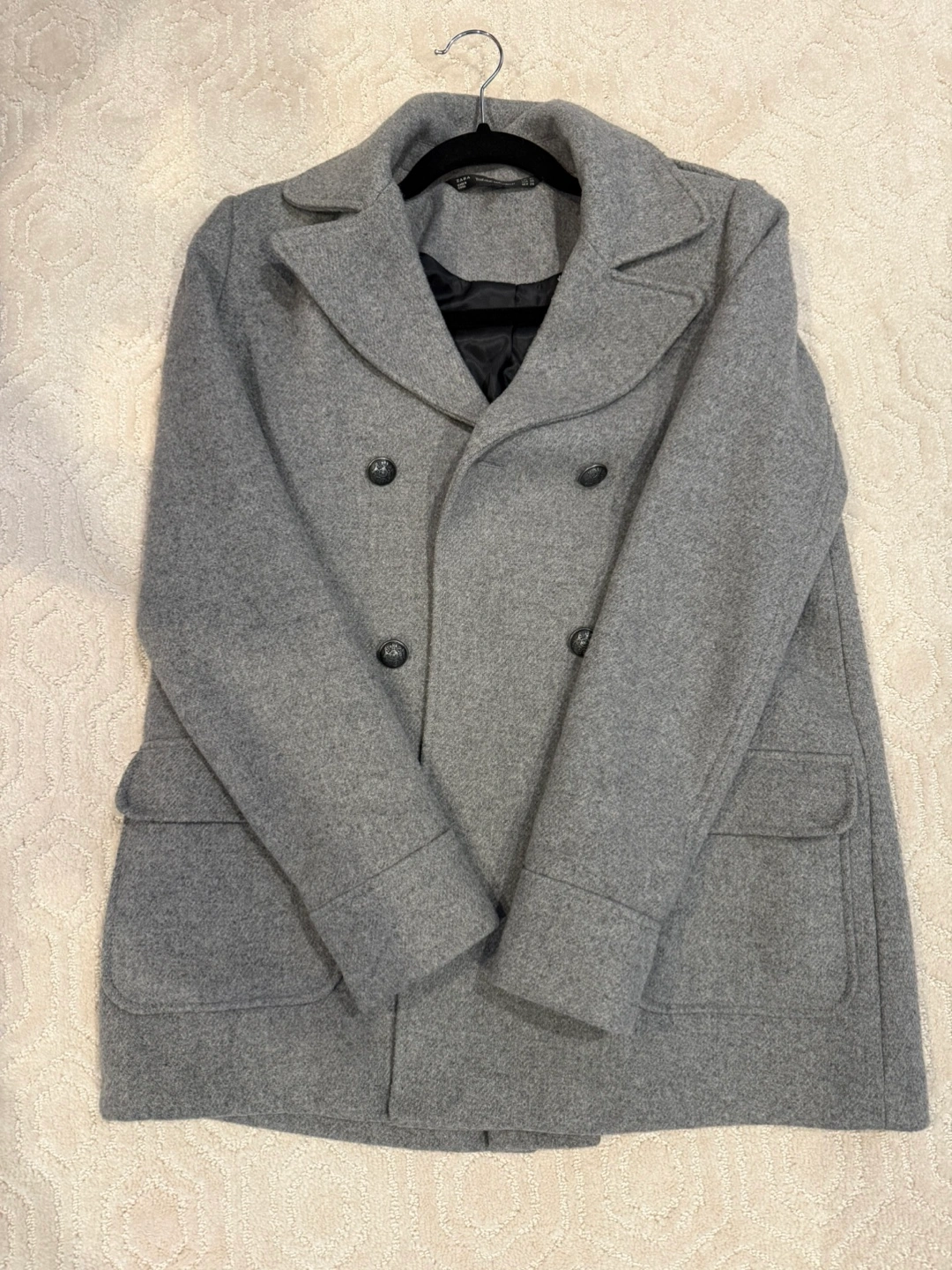 Women's grey wool peacoat. Double-breasted with black buttons, inside has a satin lining.
