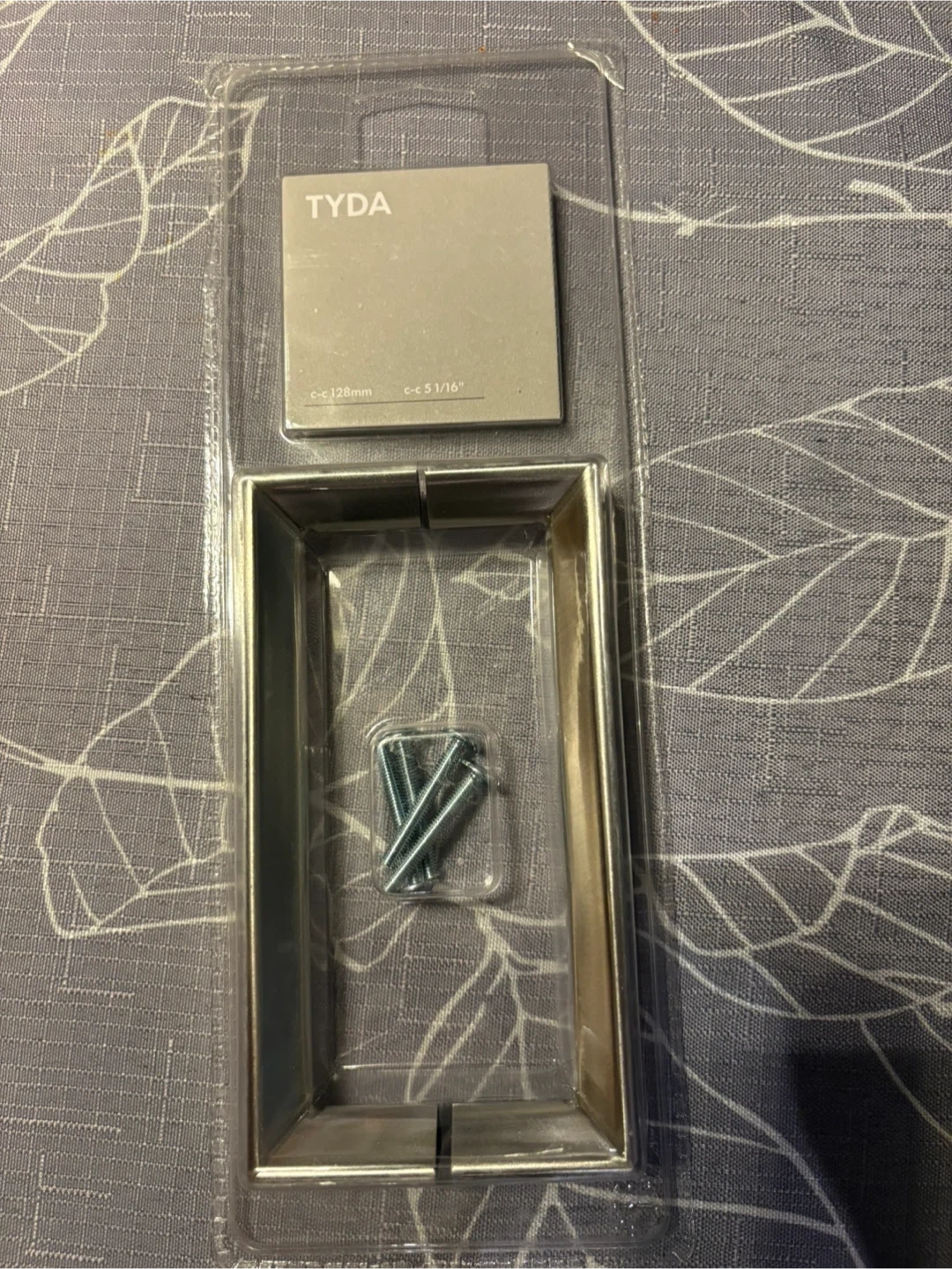Selling a brand new Ikea TYDA drawer pull still in its original packaging! The c-c measurement is 128mm, which is approximately 5 1/16 inches. It comes with the screws you need for installation.