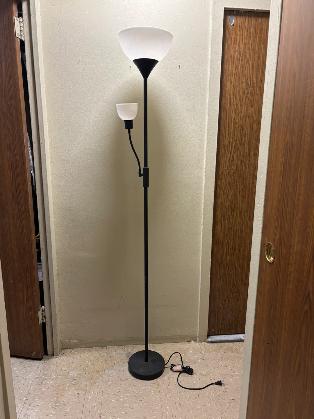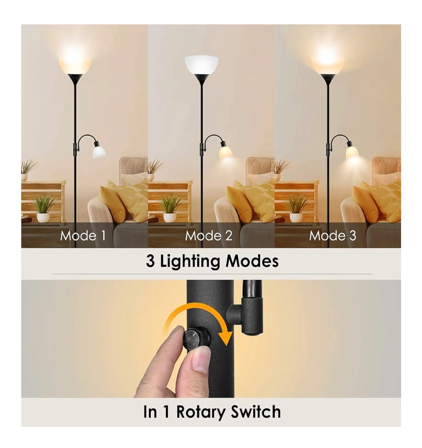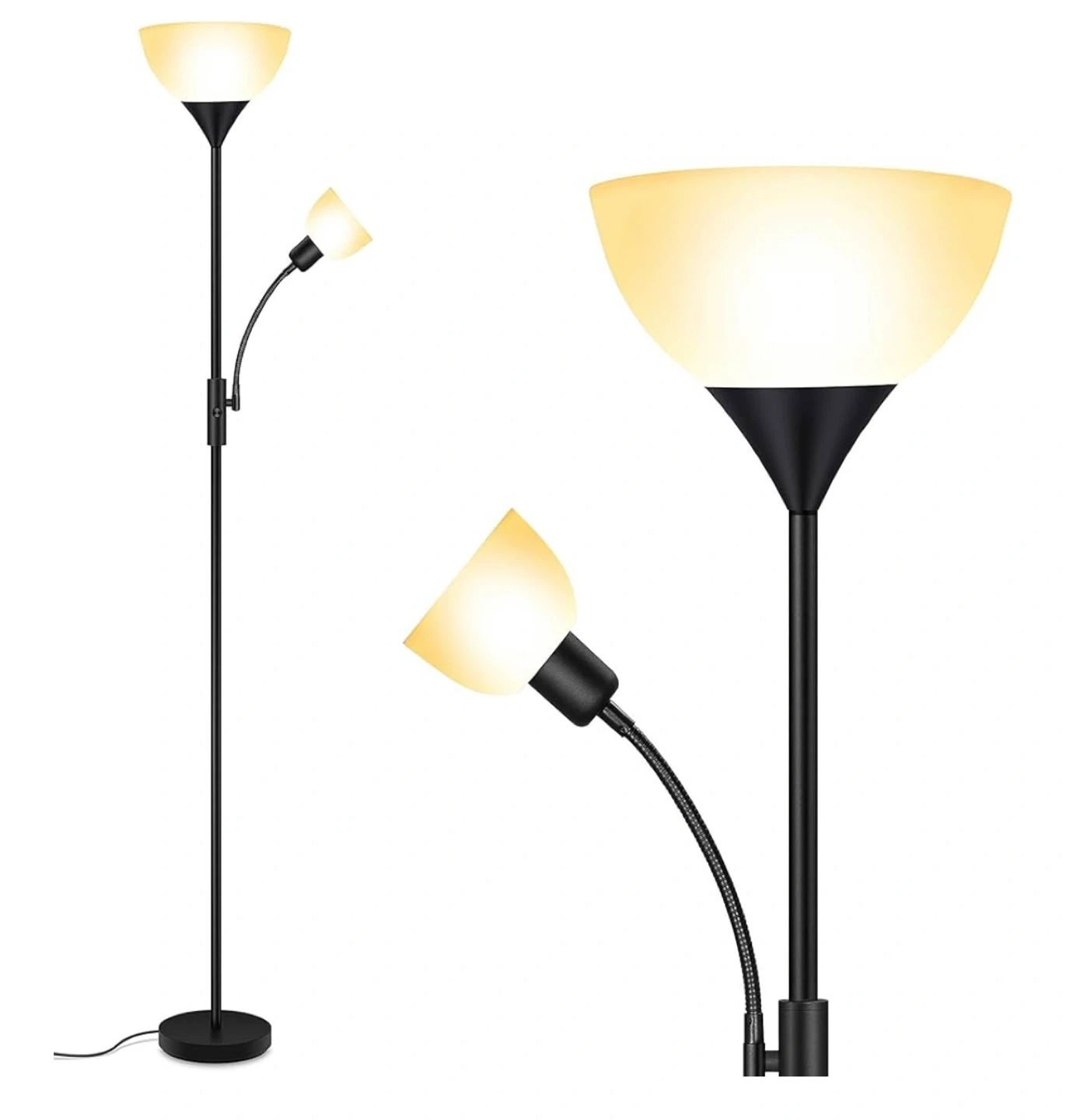 This floor lamp features a sleek black design and includes a convenient reading light. It stands at 71 inches tall, with a main shade that's 8.5 inches in diameter and a reading light shade that's 6 inches. The base is 8.7 inches wide, and the reading light extends 16.5 inches from the main pole.