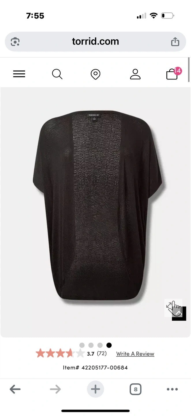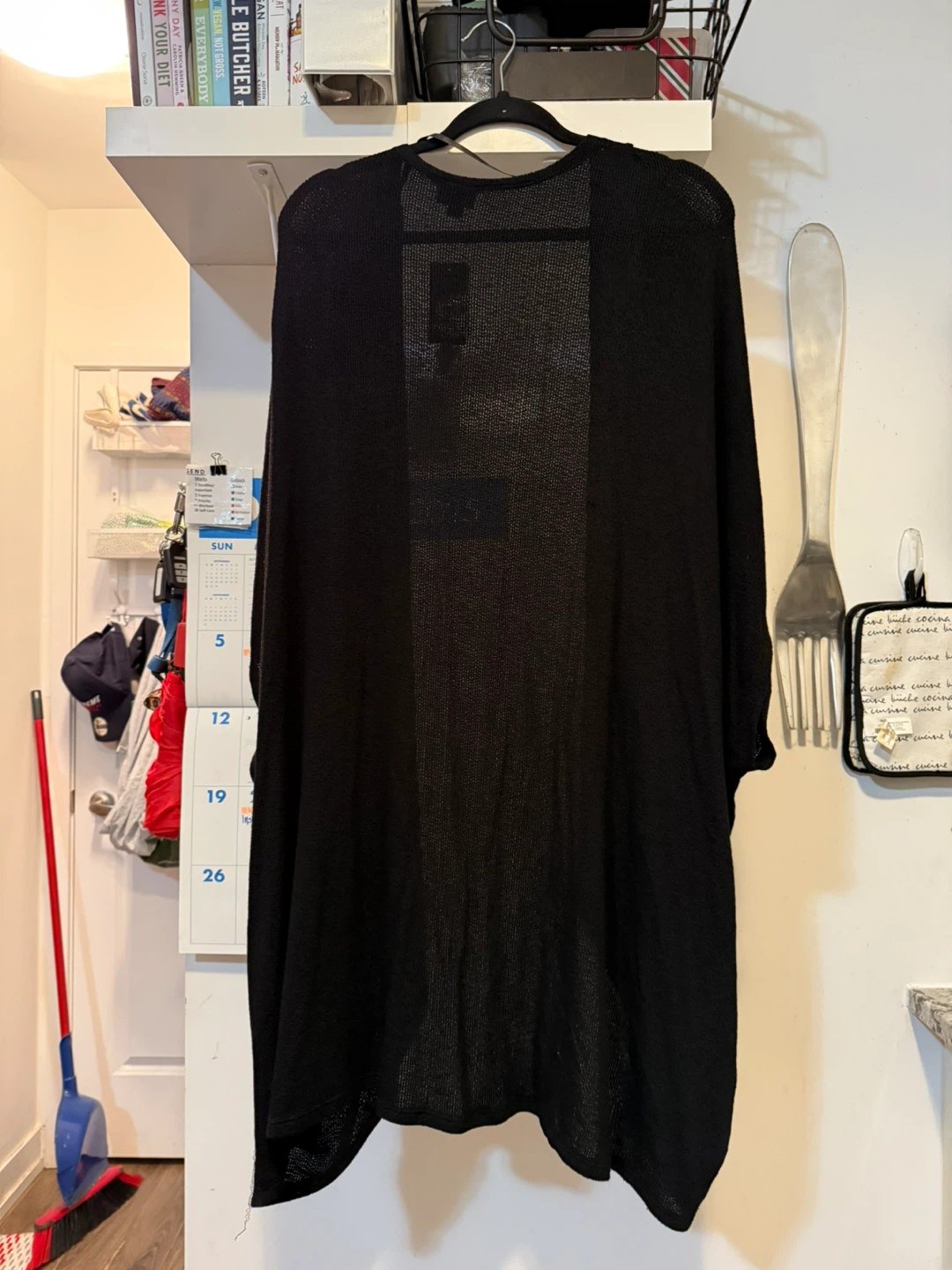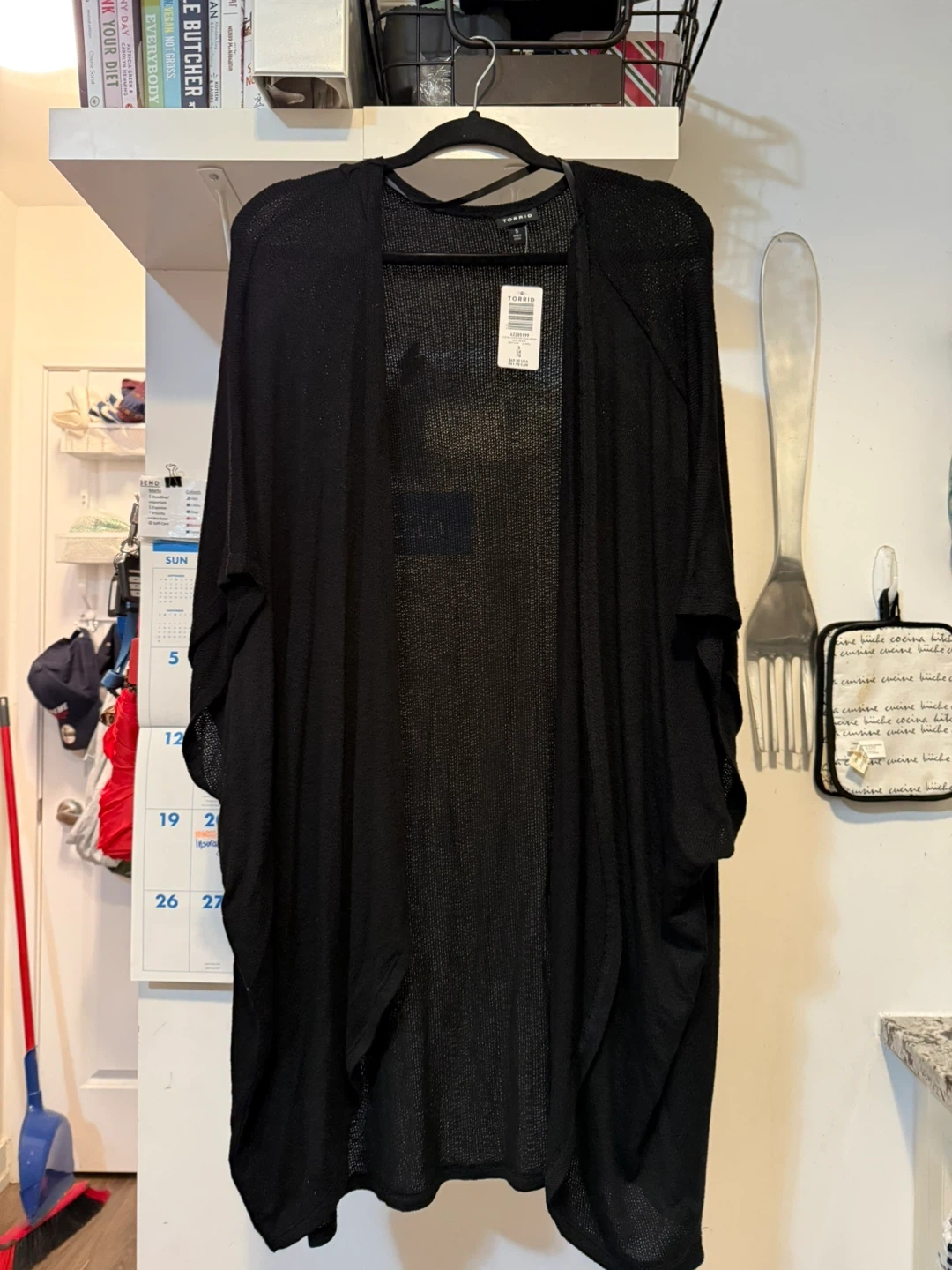 Lightweight, drapey black cocoon-style cardigan from Torrid, made in their soft slub hacci knit fabric. It has an open-front design, dolman-style sleeves, and a relaxed fit that layers easily over tanks or dresses. Breathable and stretchy — great for year-round wear.
