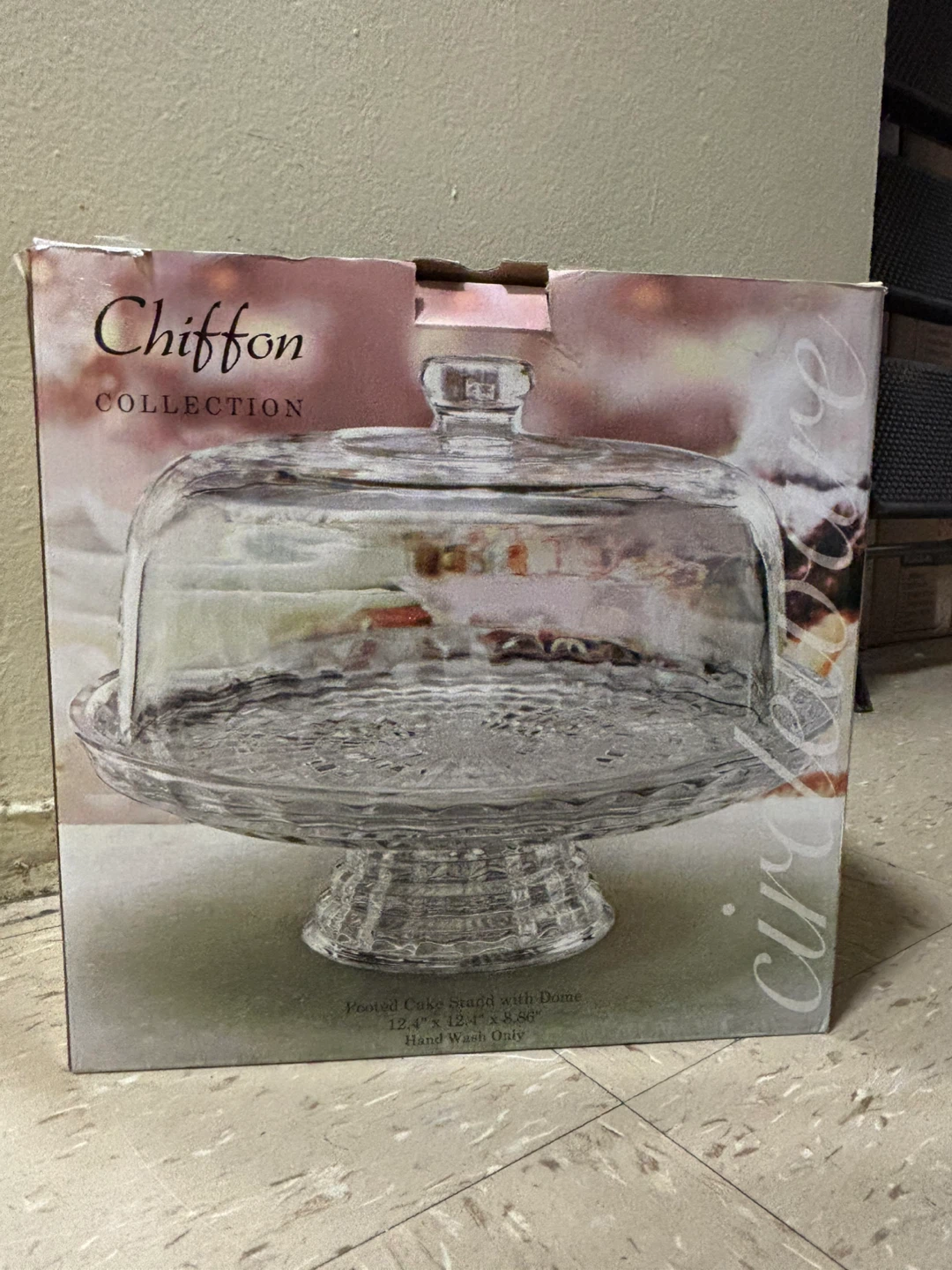 Selling a Chiffon Collection Glass footed cake stand with dome! The dimensions are 12.4" x 8.46" x 8.46". It's brand new and comes with the original box. (PICK UP ONLY)