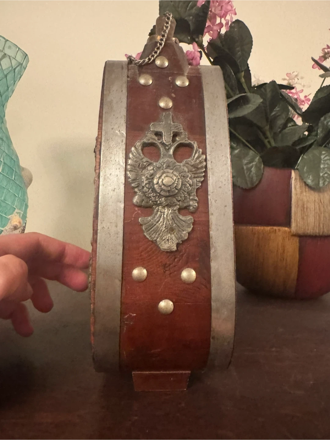 79This is a vintage antique powder flask featuring ornate metal detailing and a wooden body. The flask is in good condition considering its age, with some wear that adds to its character. A unique piece for collectors or those interested in historical items. Feel free to reach out.