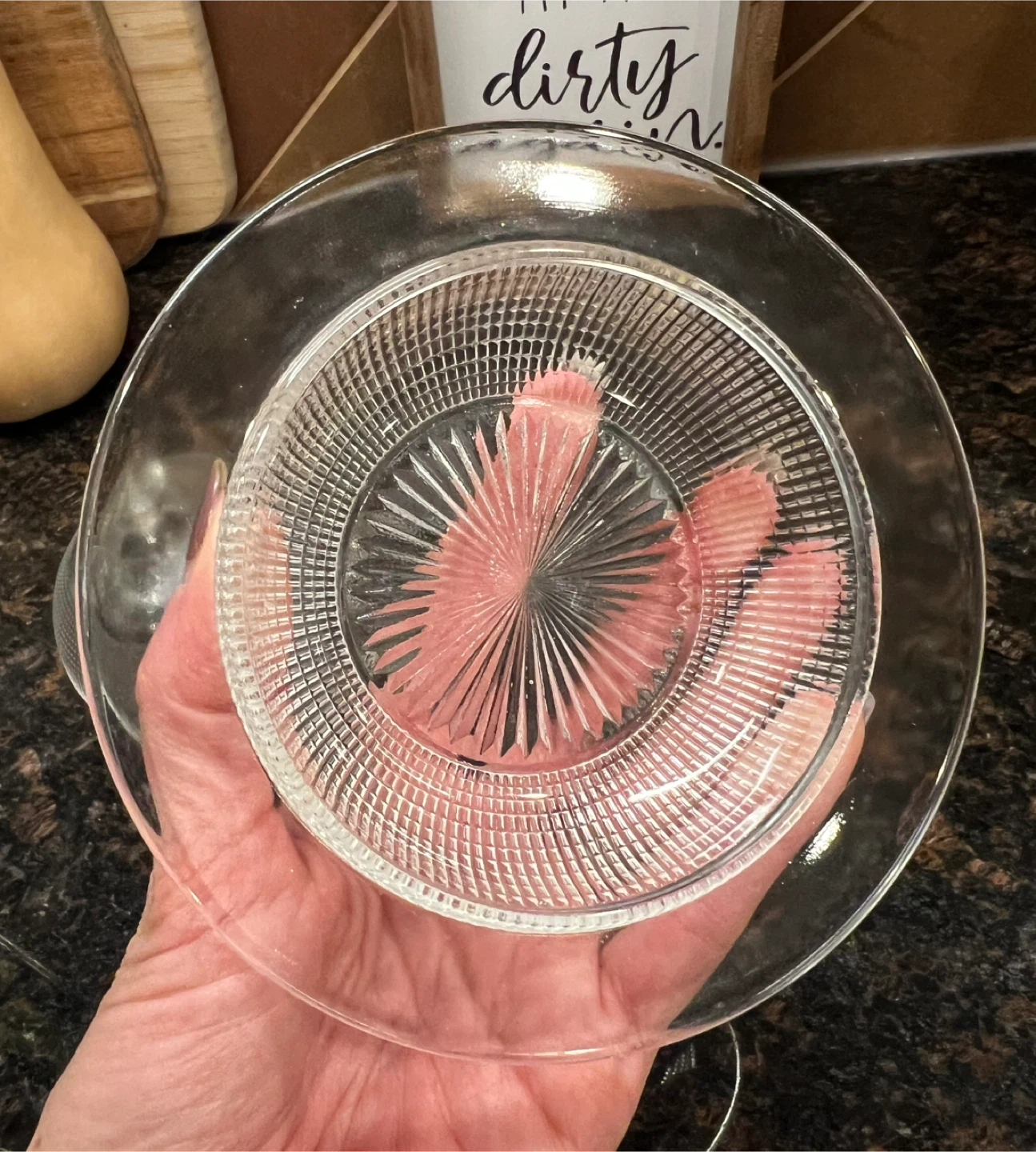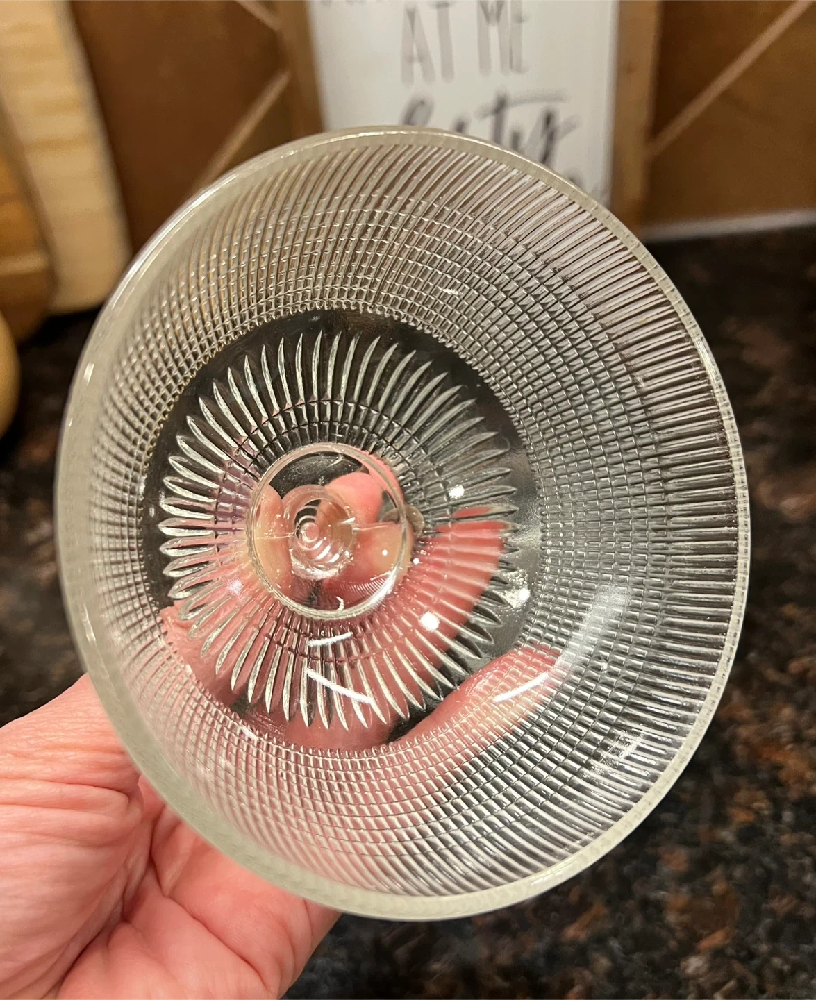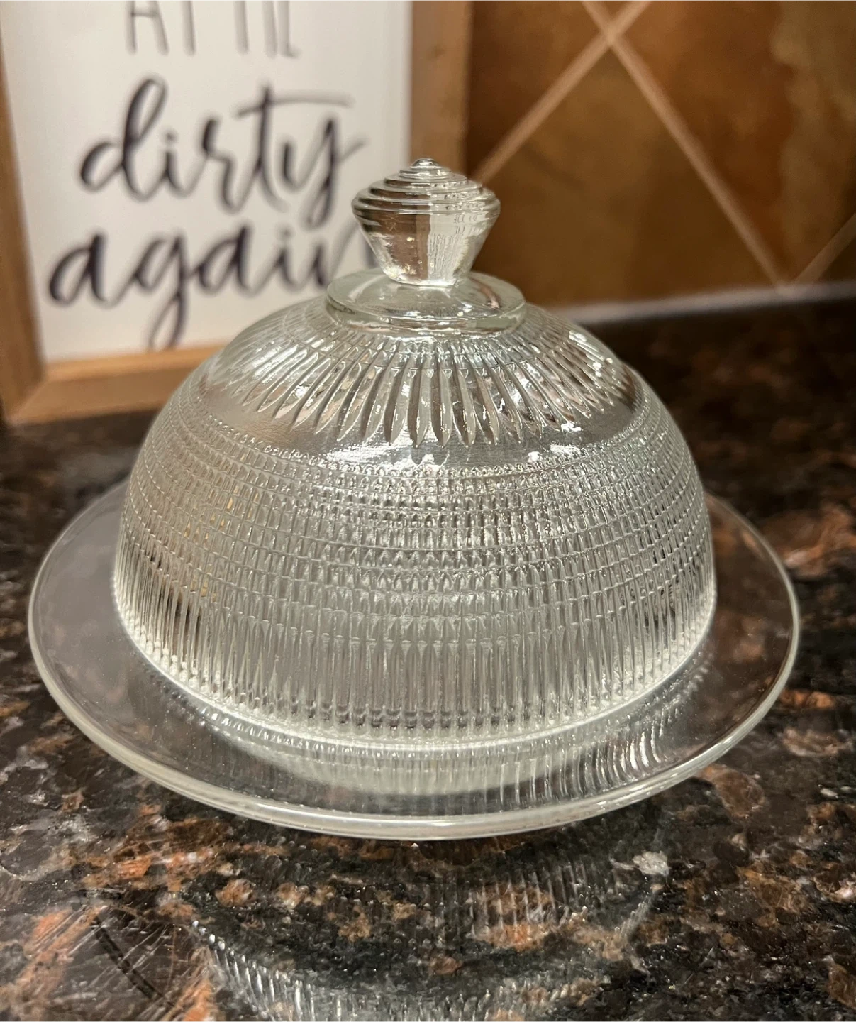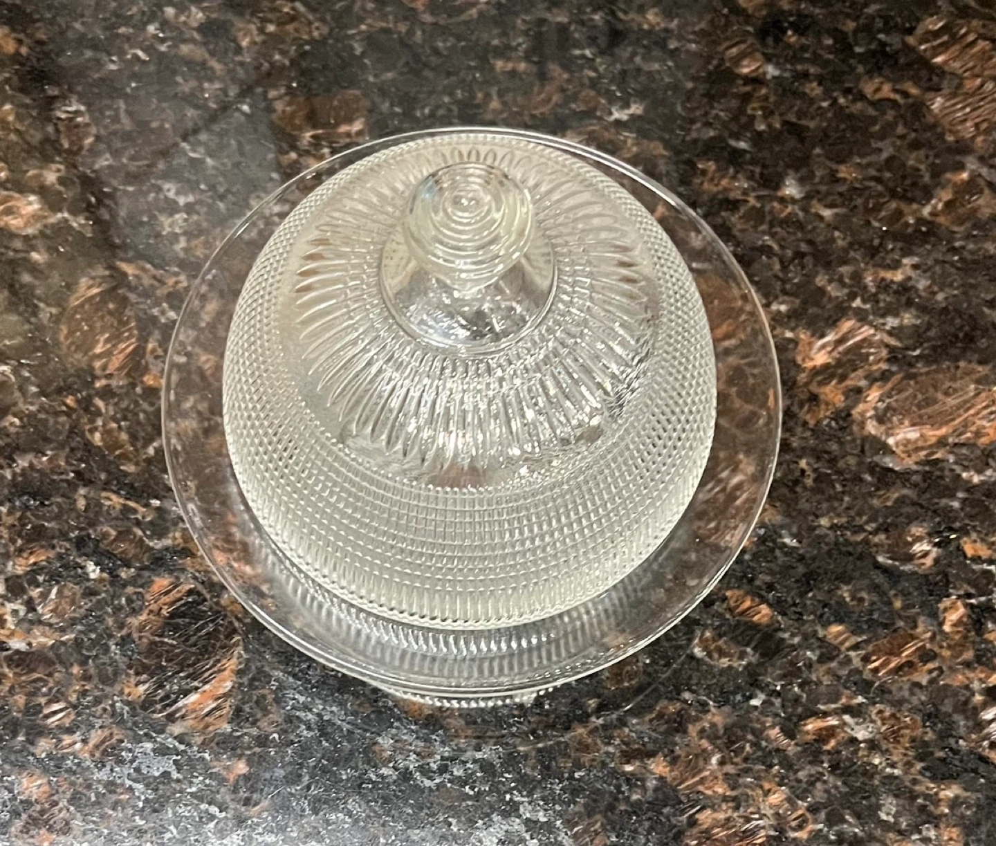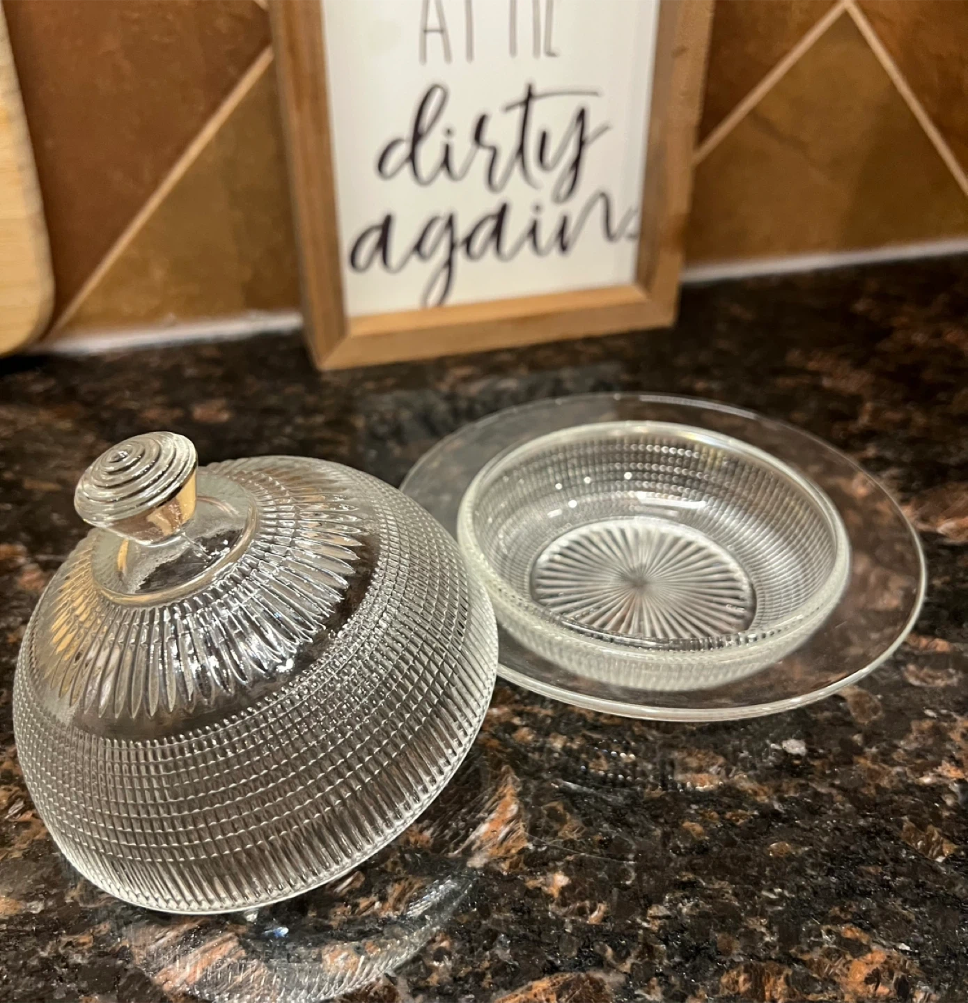 579Pattern called Saguenay defined by small fine ridges Made by Dominion Glass Co. of Canada Great condition 5.25” wide 3.75” tall (top of the lid) 3 .75” inner diameter (butter base without the rim) Beautiful, rare vintage piece!! Asking $20 Interested? Message me and please check my other listings….