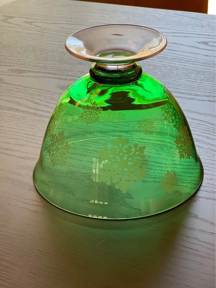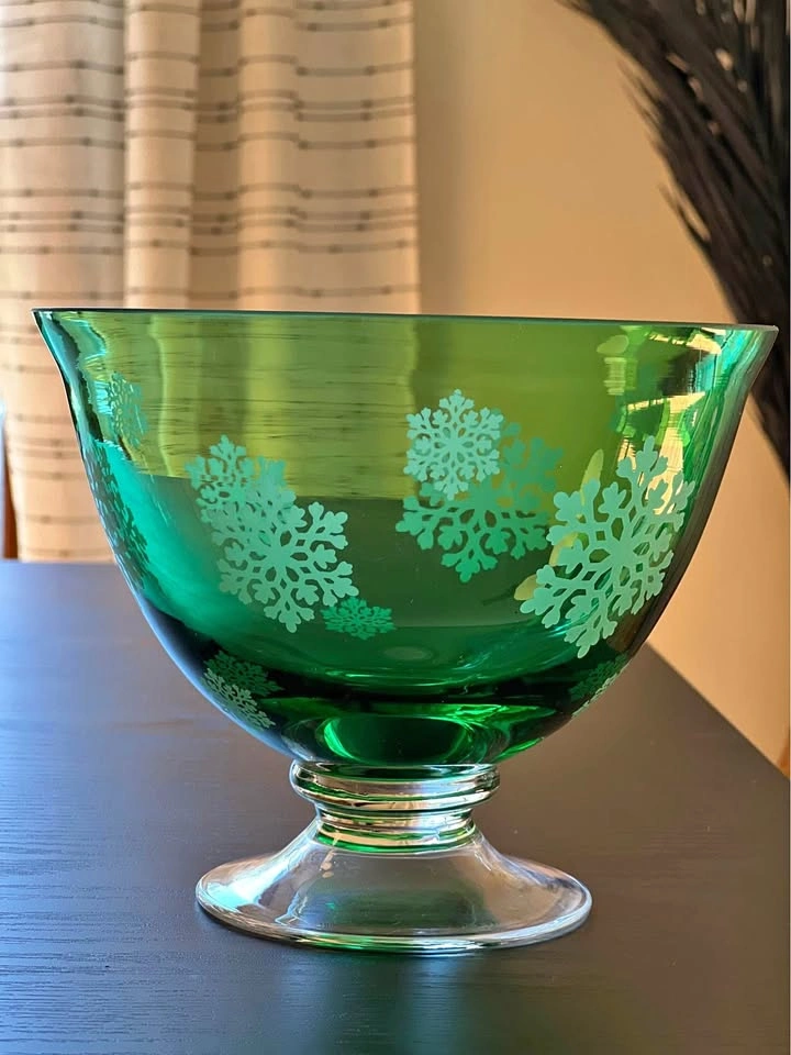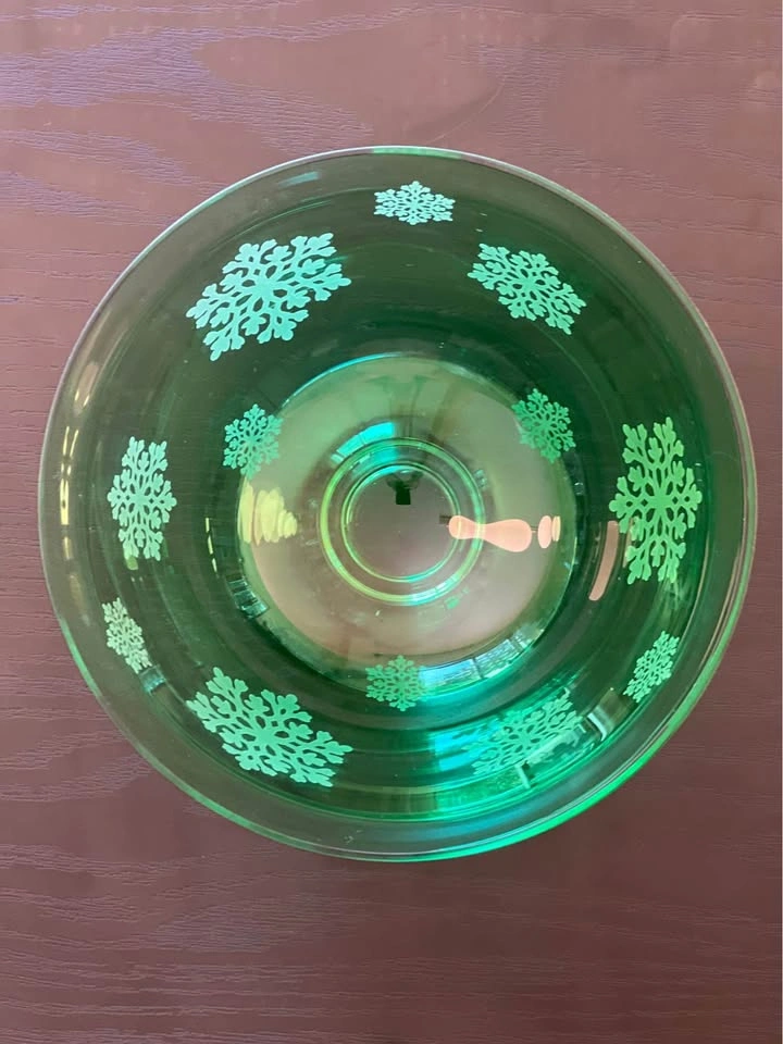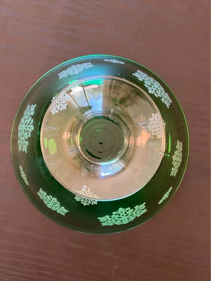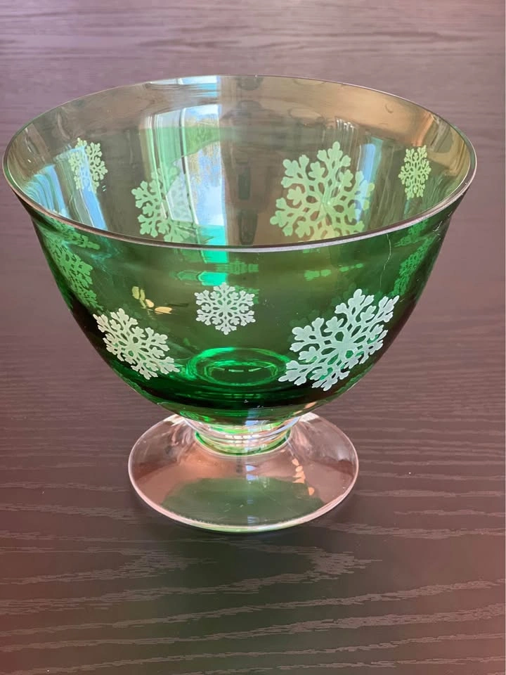 Vintage MCM 1960’s Green Bowl with clear footed base and frosted snowflakes. Excellent condition Dimensions: 5.5 high 7" diameter at rim 4" diameter base
