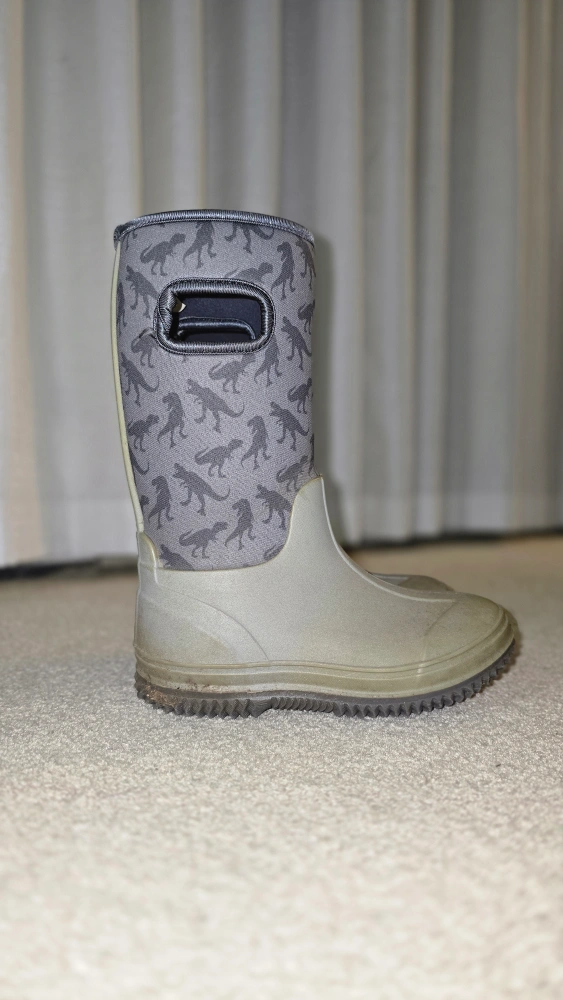 A collection of kids' shoes and boots in various sizes and conditions. There are Bogs dinosaur print boots, winter boots, green boots, Jordan sneakers, Champion sneakers, and black slip-on shoes. Good for play!