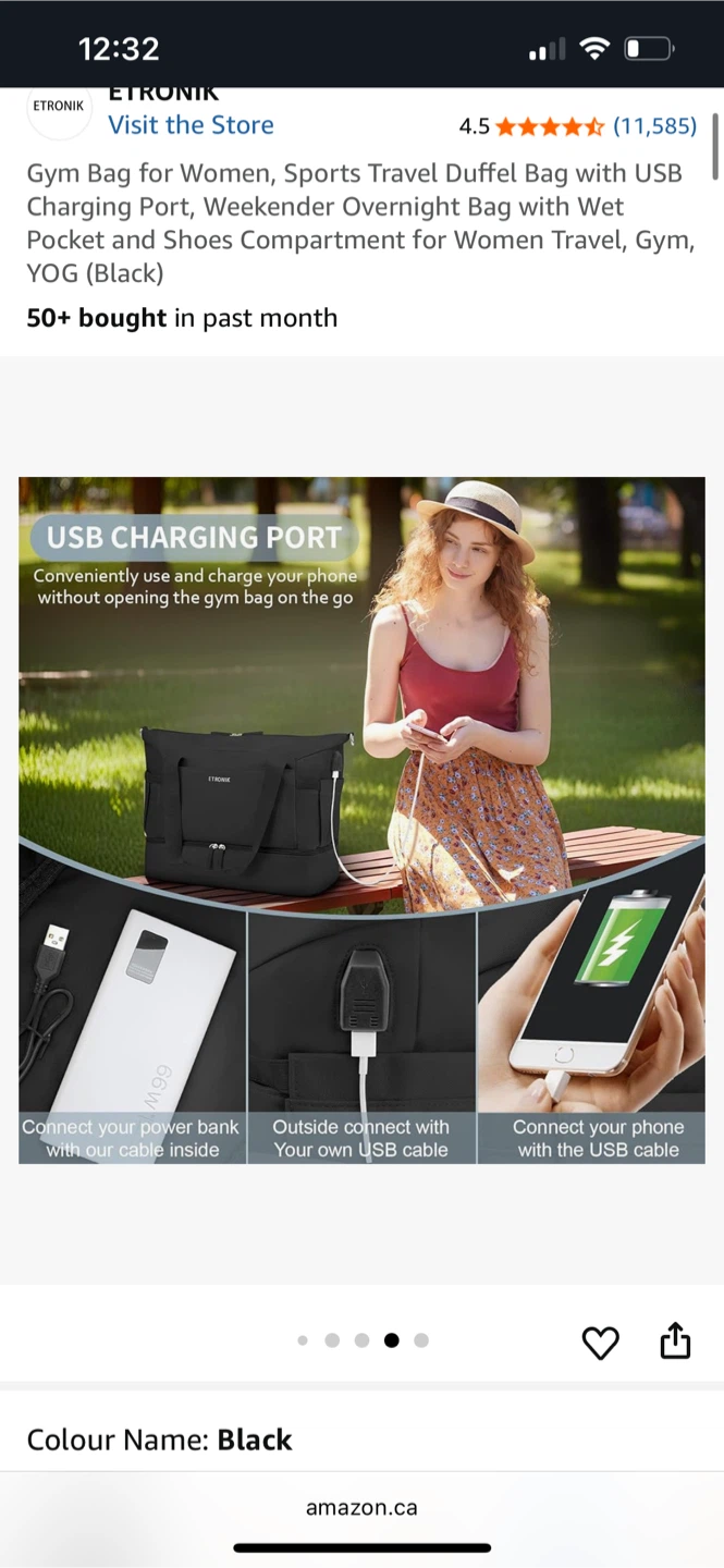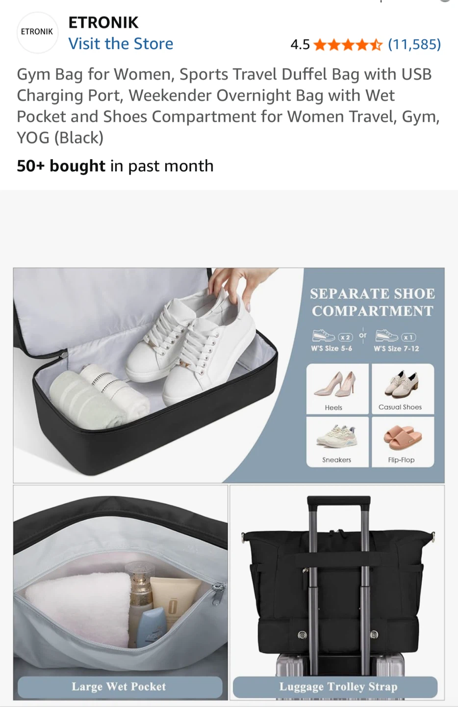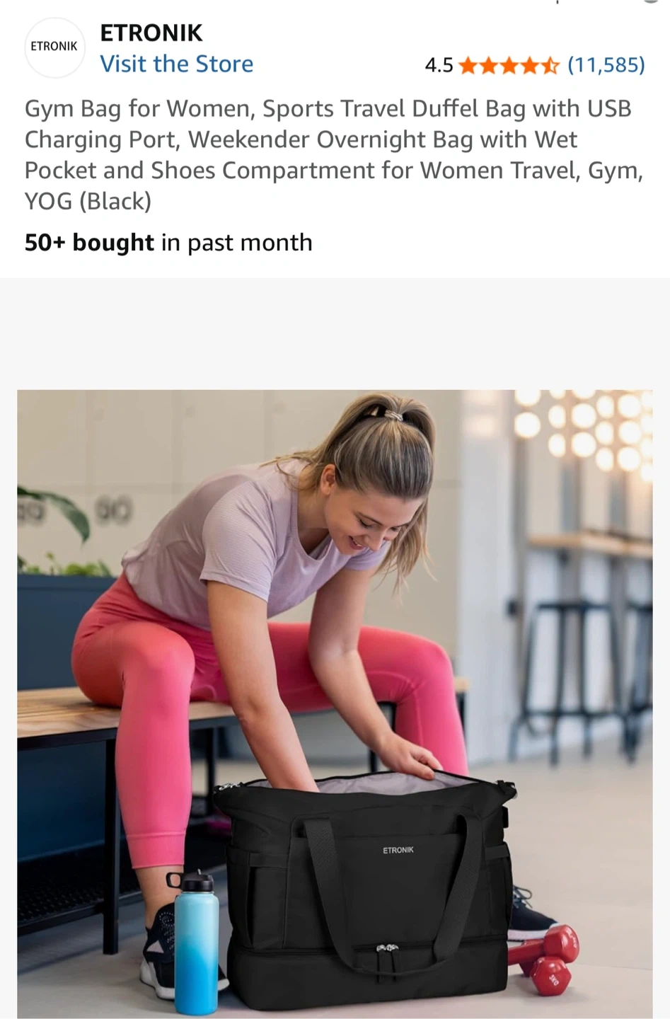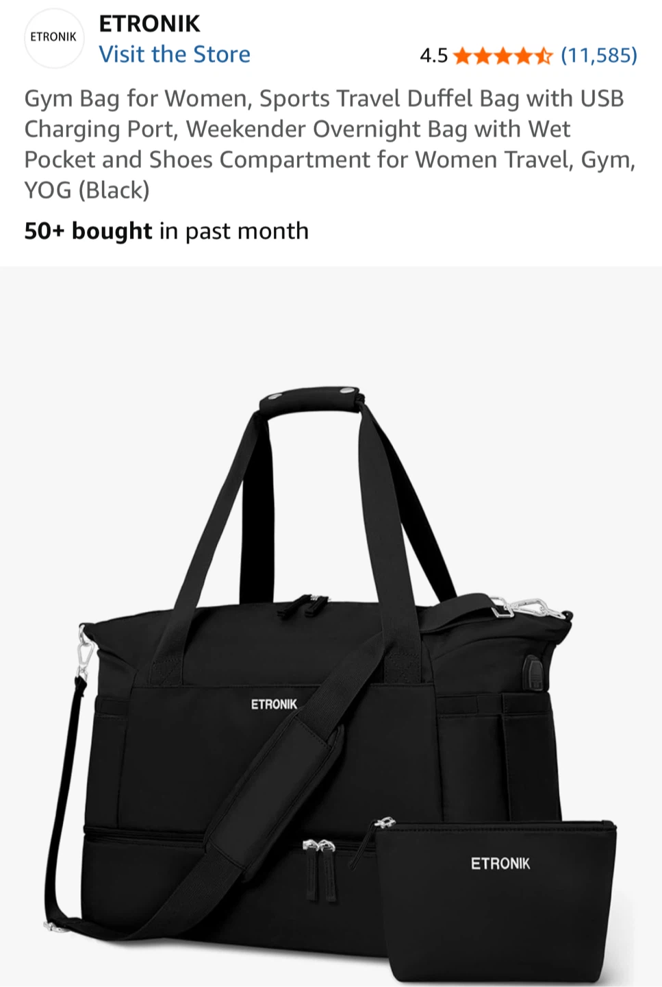 Looking for a versatile gym bag? This ETRONIK duffel bag is perfect for women on the go! It features a USB charging port, a wet pocket, and a separate shoe compartment. It's great for the gym, sports, travel, or even just a weekend getaway