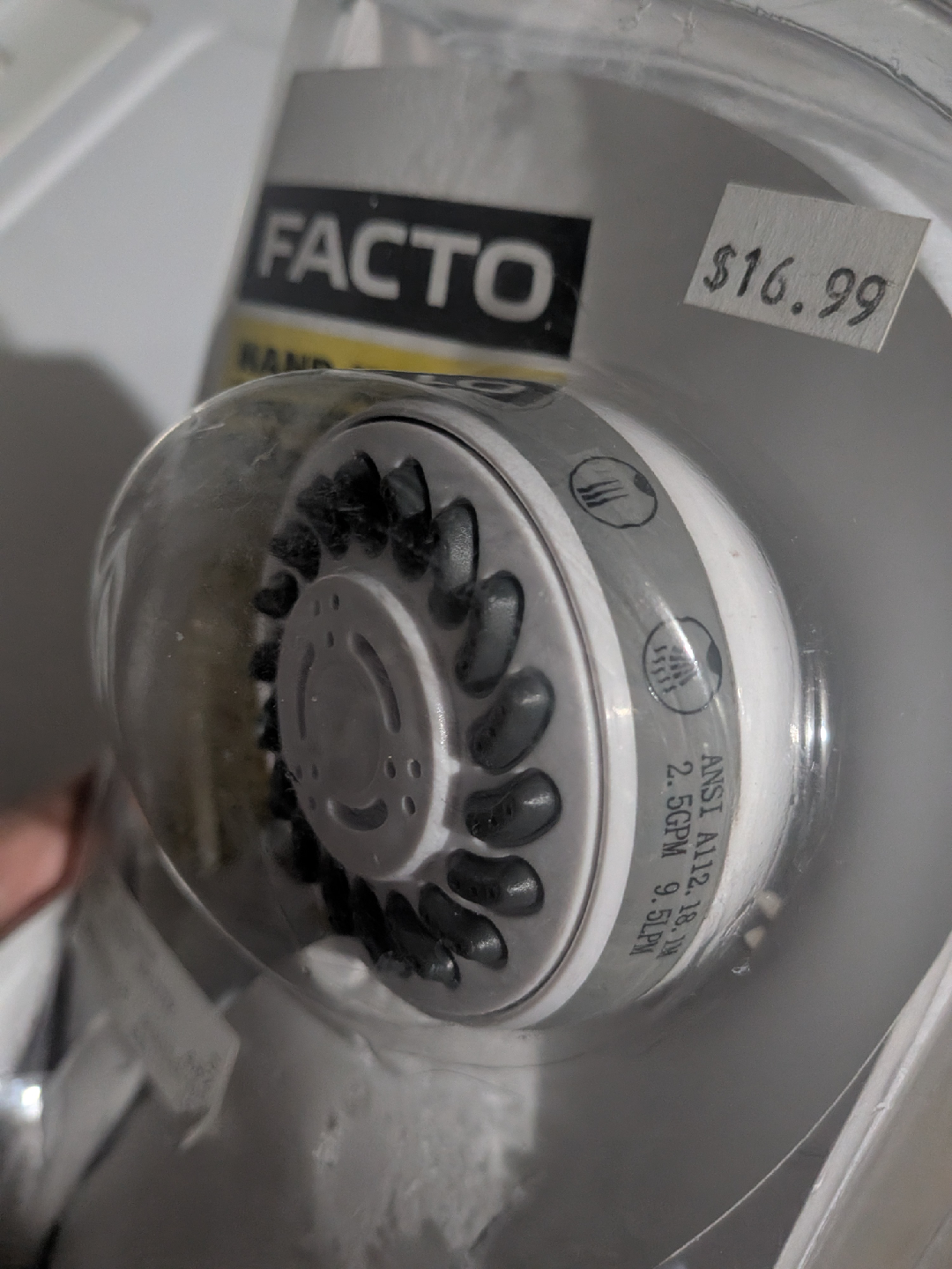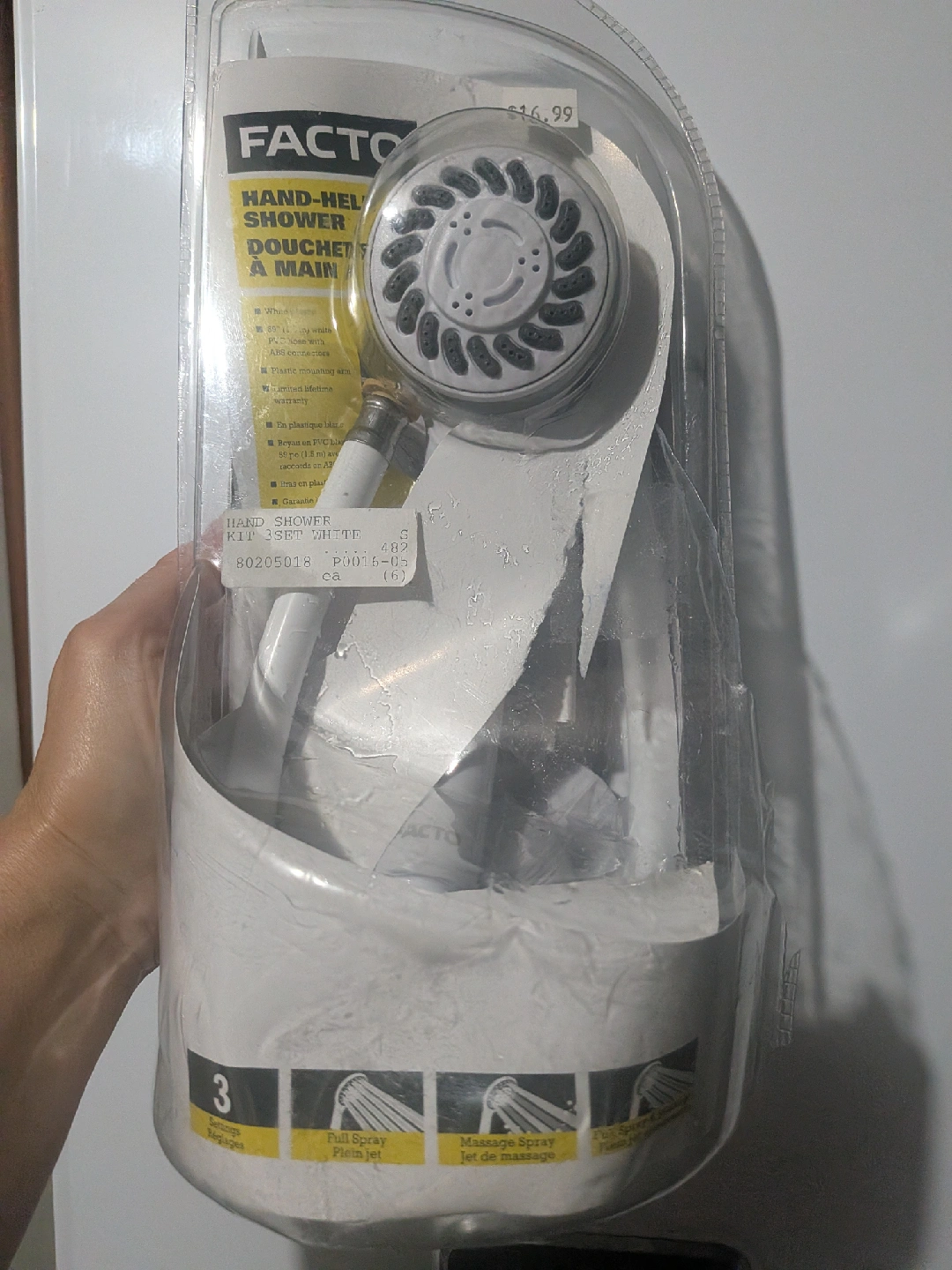I'm selling a brand new Facto hand-held shower kit! It comes with 3 spray settings: Full Spray, Massage Spray, and Full Spray/Thin Jet. The shower head is white plastic with ABS connectors. It includes a 59" (1.5 m) white PVC hose. Originally priced at $16.99.