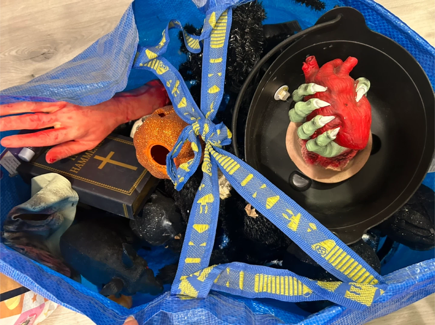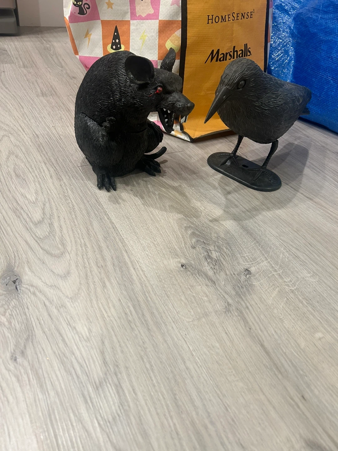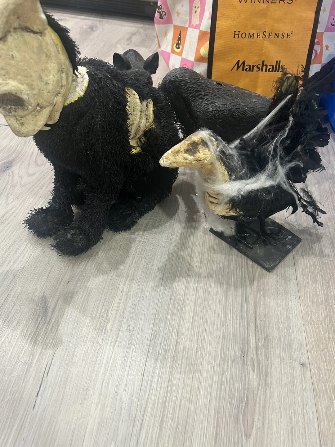 Selling a collection of Halloween decorations! There's a black cat skeleton, a black rat with red eyes, and a black crow. Halloween masks , and pumpkins and various different other Halloween decorations. And candy bowel and more Perfect for spooky season, plus large bag packed with items from spirit of Halloween store and home sense &more. All for 20 for the whole lot. To spread Halloween spirit ππ§‘