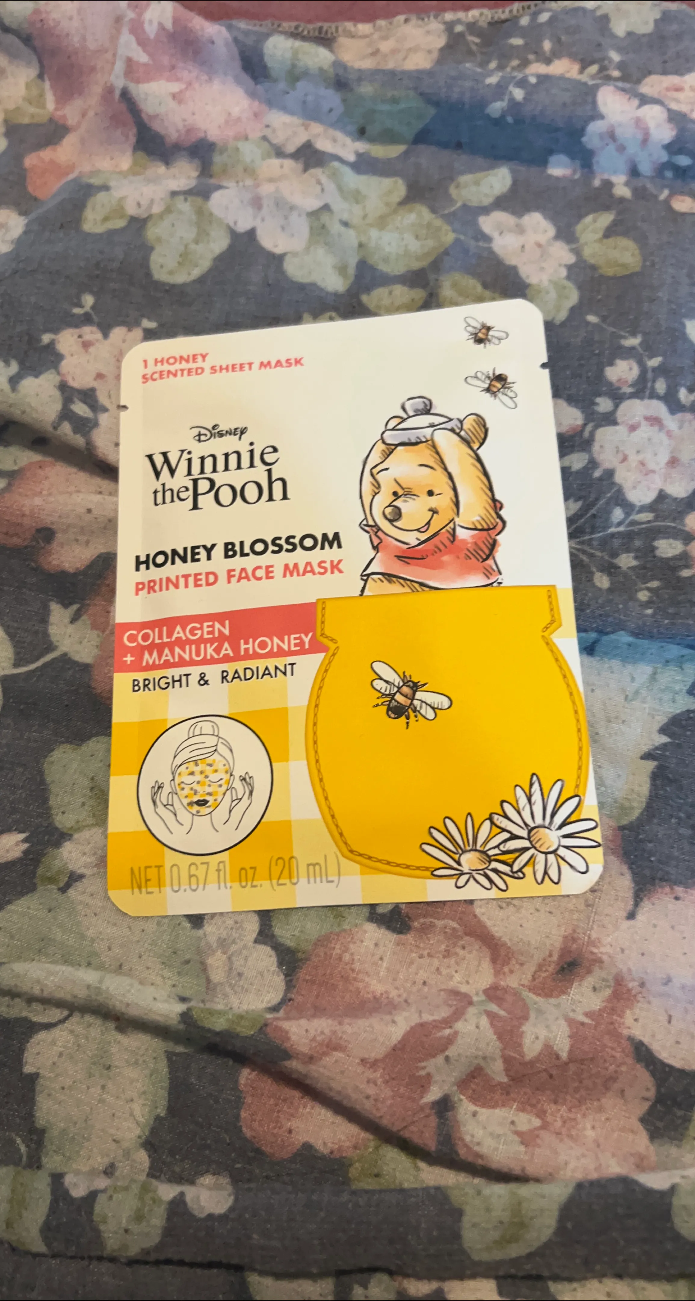 Selling a Winnie the Pooh Honey Blossom printed face mask! It's a honey-scented sheet mask with collagen and manuka honey for a bright and radiant complexion. Contains 0.67 fl oz (20 mL)