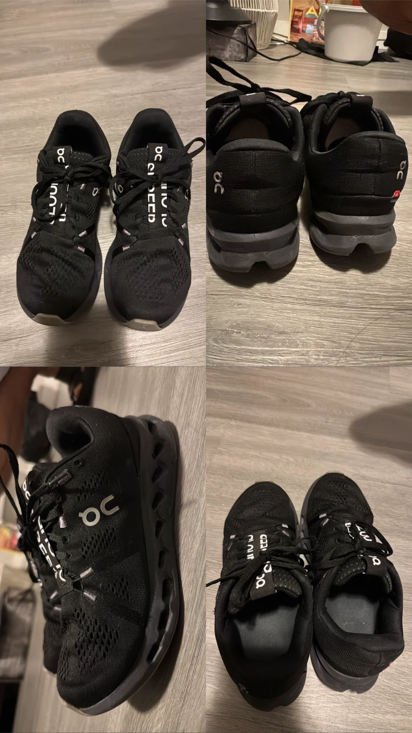 10Selling a pair of On Cloudmonster running shoes in all black! These shoes are super comfortable and great for everyday wear or running. They feature a unique design and cushioning system. They are in good condition with some signs of wear.