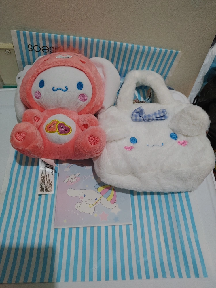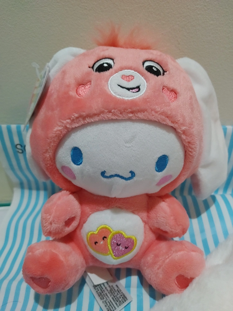 33Set includes (1) Brand new limited edition plushie - Hello Kitty x Carebear Cinnamoroll Dressed Up as Love-a-lot Bear - 9 inches (1) Small fuzzy cinnamoroll bag with detachable shoulder strap. can fit cell phone and other smaller items like keys and lip gloss. (1) Small Cinnamoroll notebook note card $15 for alk Good for care bear and or Sanrio fans or as gift. Sold as set. Thanks!