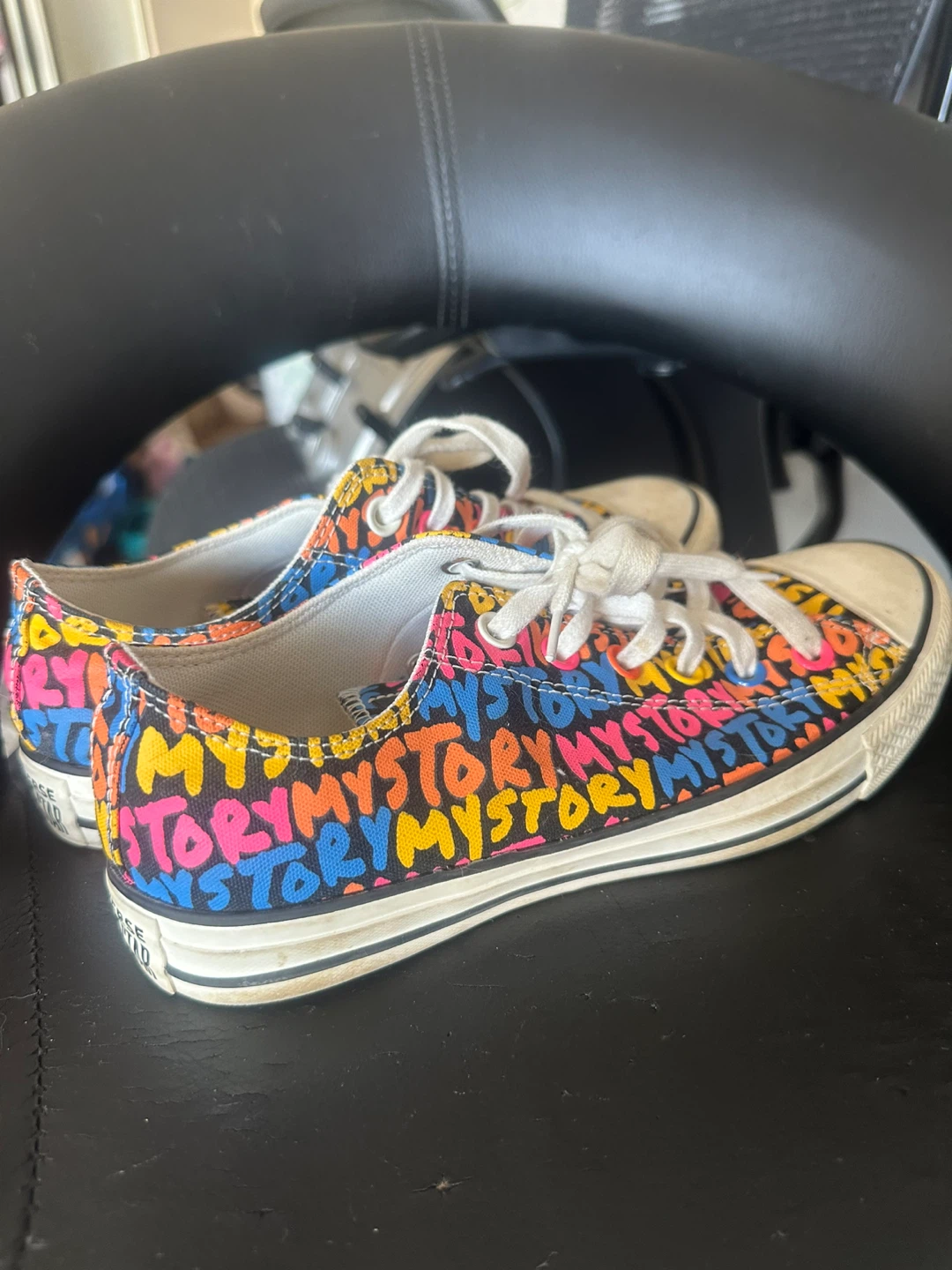 Selling a pair of Converse All Star low top sneakers with the 'My Story' design! The shoes feature a colourful, all-over print with the words 'My Story' in various fonts and colours. They're in great condition and ready for a new home. Perfect for adding a pop of colour to your outfit!
