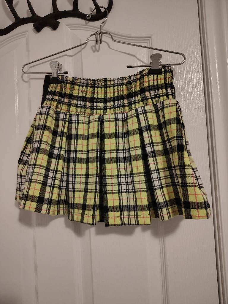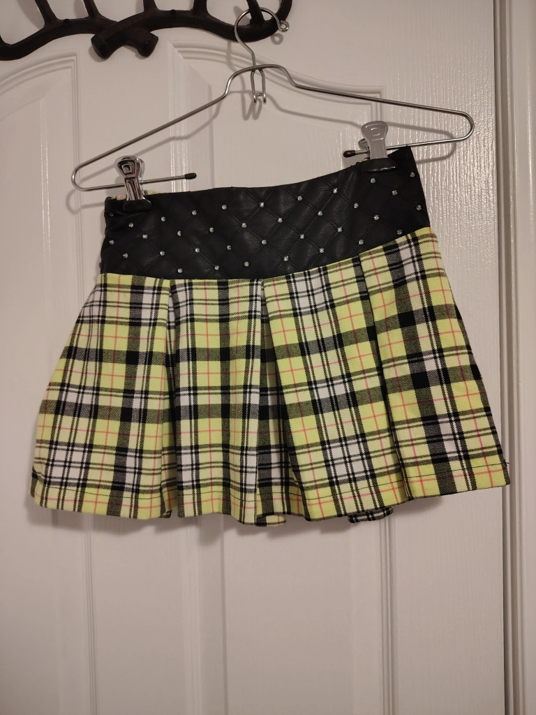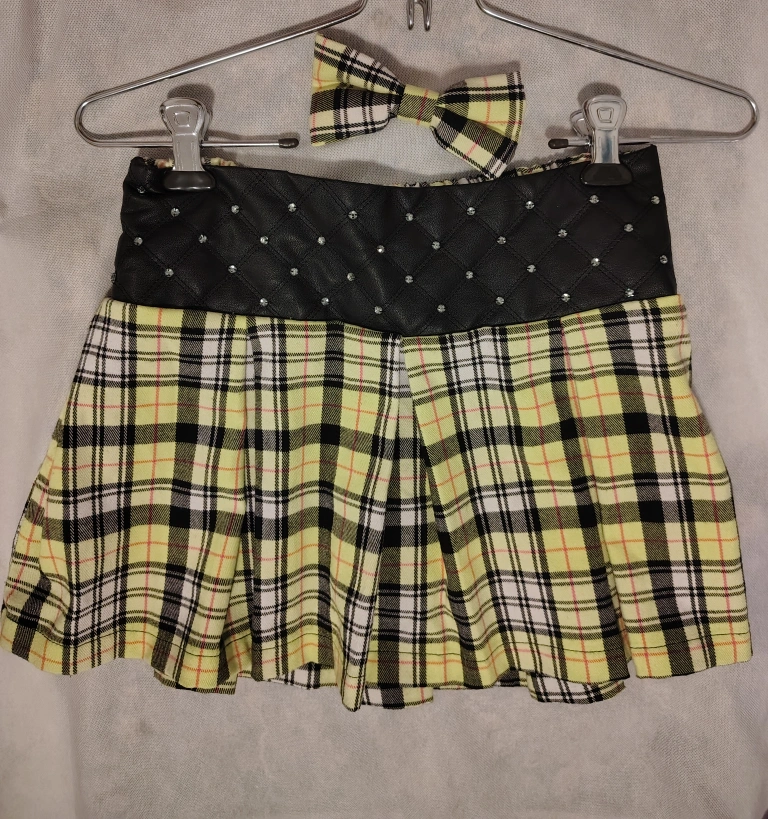Cute yellow plaid skirt with a black faux leather waistband. It has some rhinestone detailing and comes with a matching bow! The skirt is in great condition and ready for a new home. Has built in shorts!
