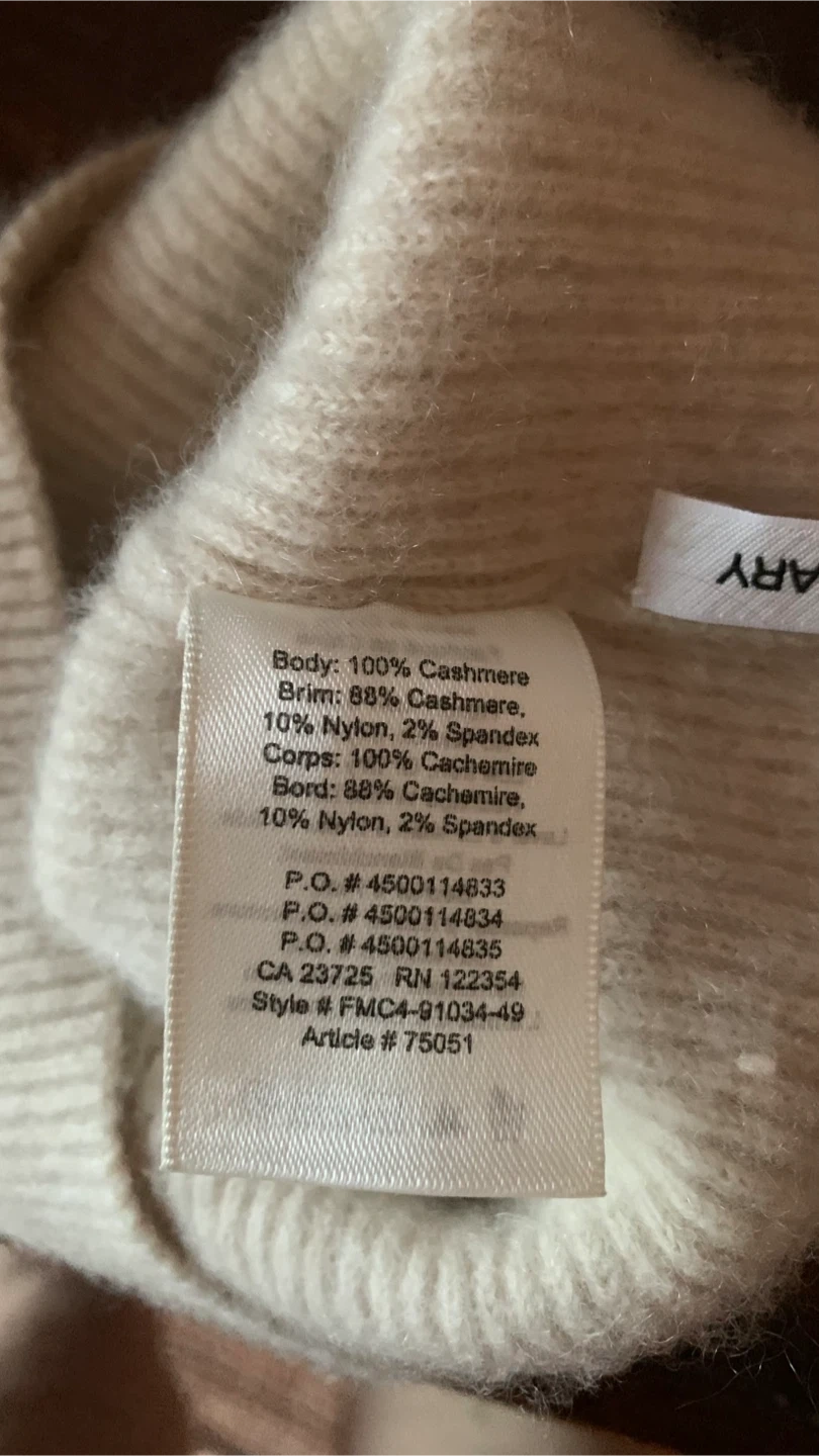 1000+Cozy up with this Aritzia beanie! It's made with 100% Cashmere and is a beautiful cream. The brim is 88% Cashmere, 10% Nylon, and 2% Spandex, so it has a nice bit of stretch. Perfect for those chilly Canadian days!