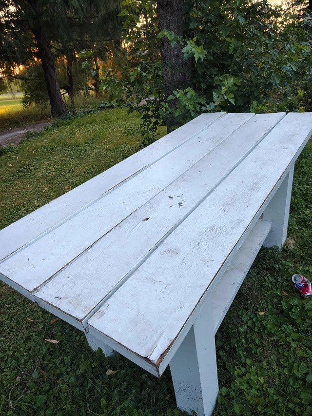 This used picnic table features a sturdy construction, perfect for outdoor gatherings. While it shows signs of wear, it's still a functional and charming addition to any backyard. This picnic table is ideal for anyone looking to add some seating to their backyard, or who appreciates the timeless charm of a rustic, well-loved outdoor furnishing. With a bit of care, it will be the scene of many backyard memories for years to come. If the ad is up, the table's ready for a new home!