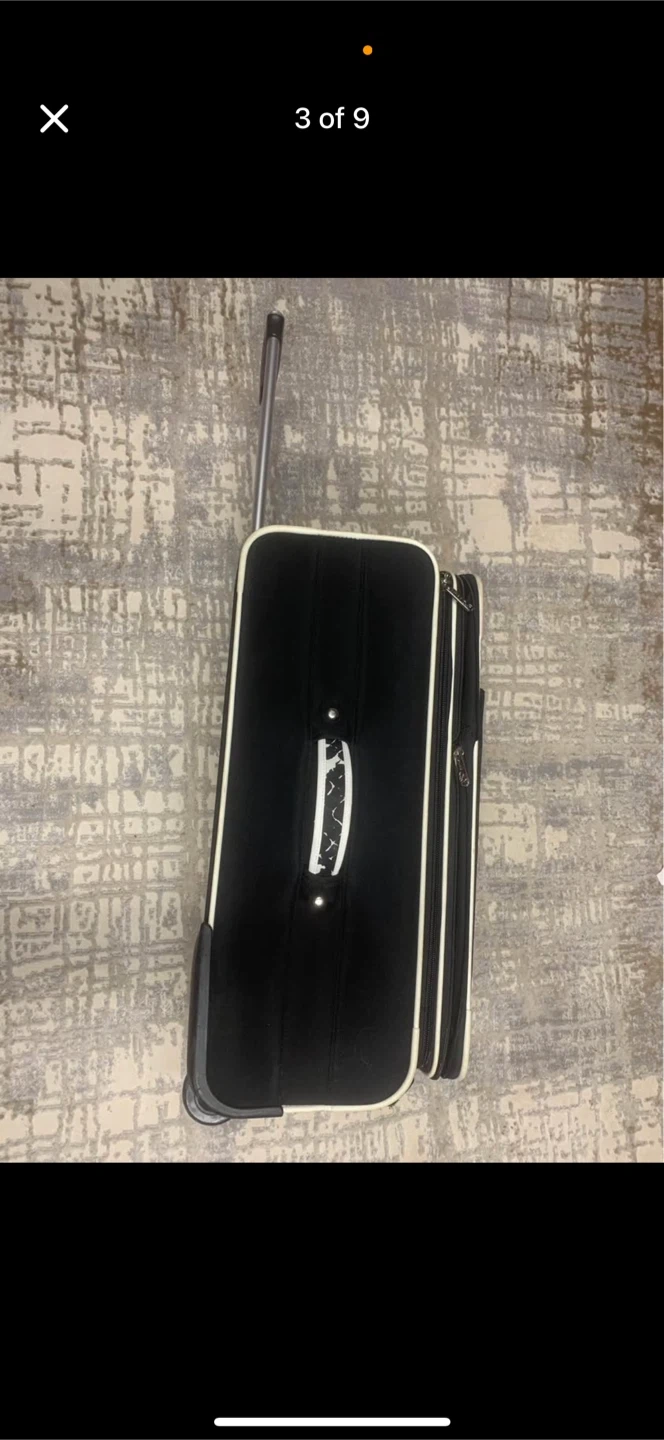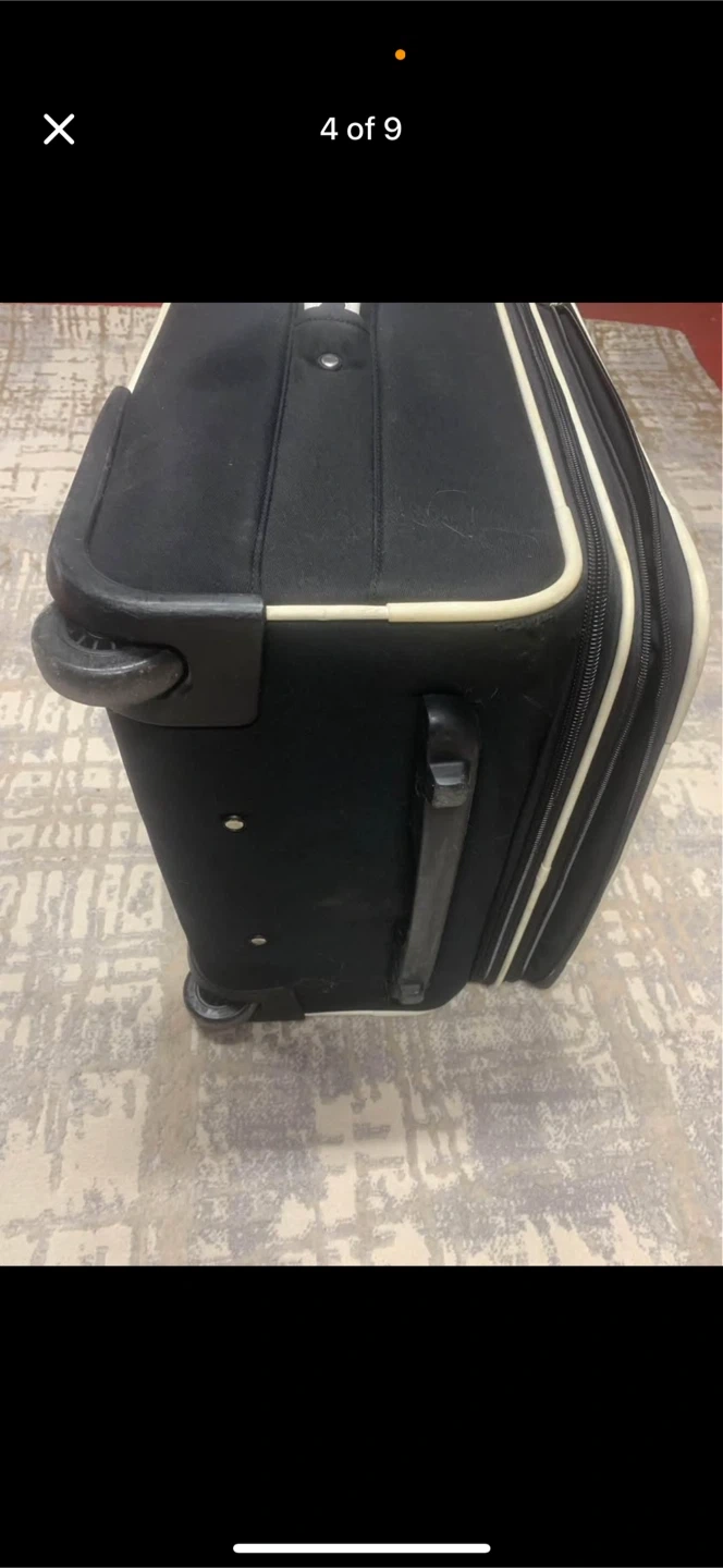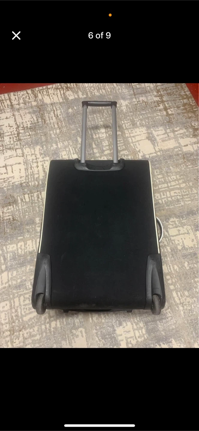 black rolling suitcase. It has a red interior and a retractable handle. Great for travel