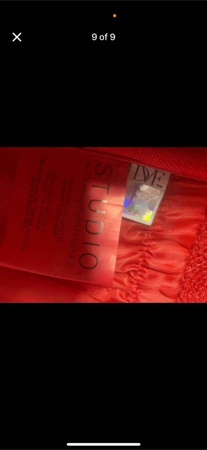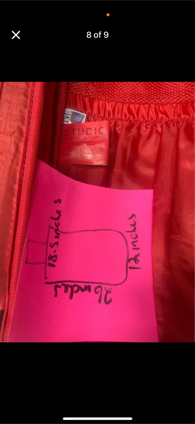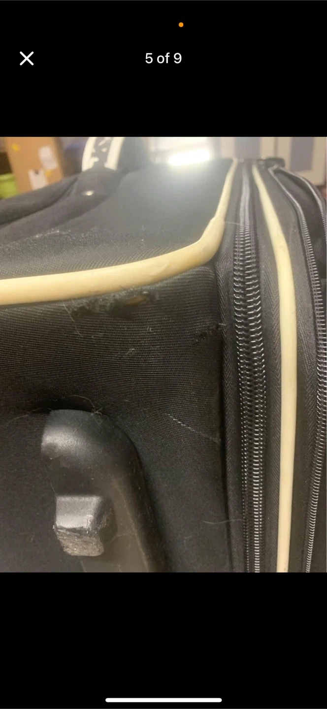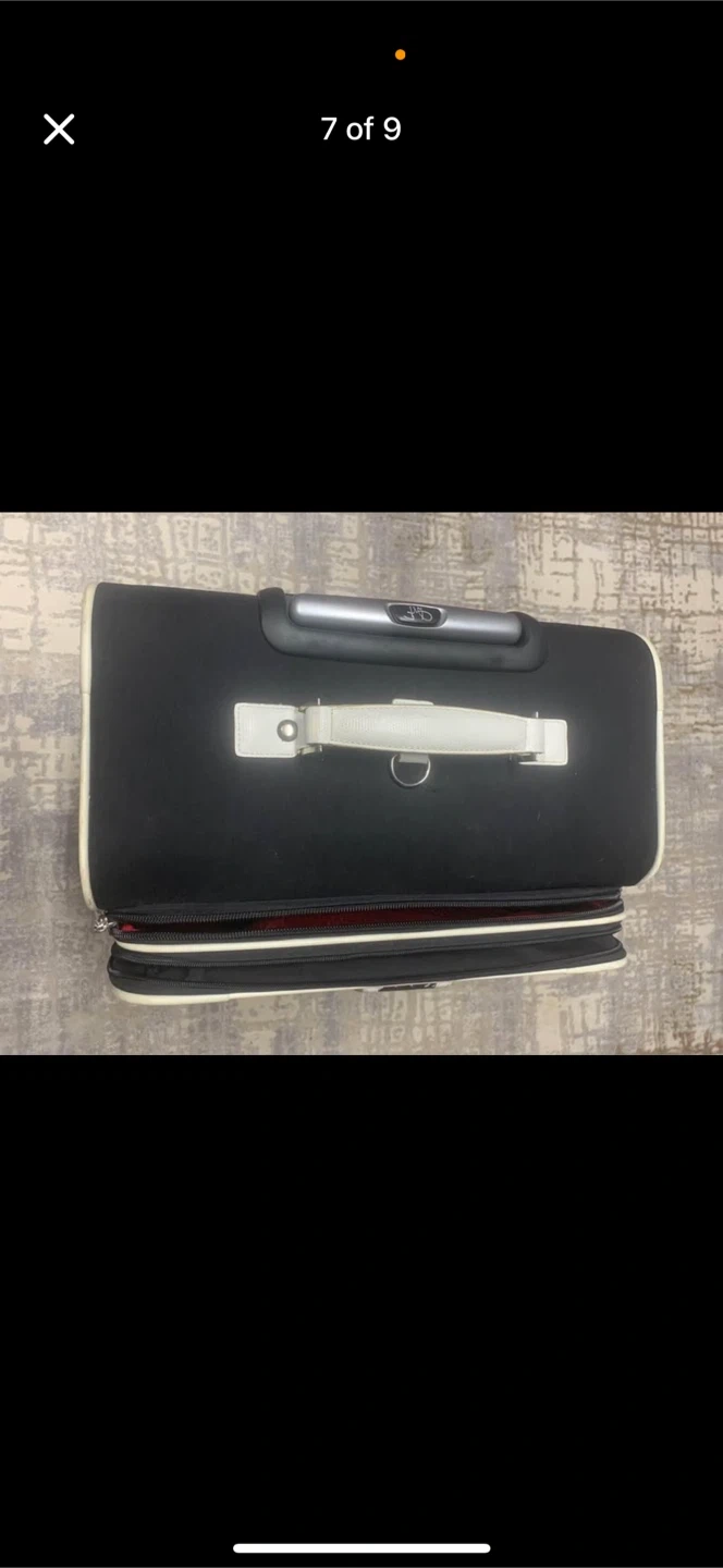 black rolling suitcase. It has a red interior and a retractable handle. Great for travel