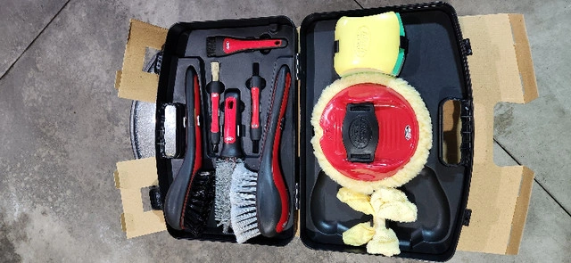 It includes the following items (stored in a handy carrying case): wheel brush, spoke brush, tire brush, dusting brush, vent brush, finishing tool, applicator pads and hand waxing system.