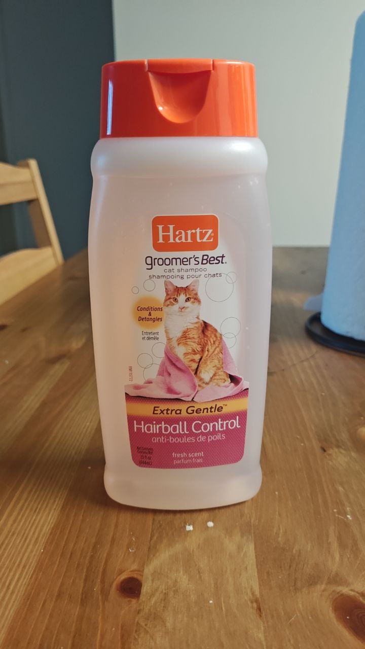 Hartz Groomer’s Best Extra Gentle Cat Shampoo – Hairball Control formula (444ml). Helps reduce shedding and hairballs while conditioning and detangling fur. Fresh scent, safe for regular use. Lightly used, clean bottle.
