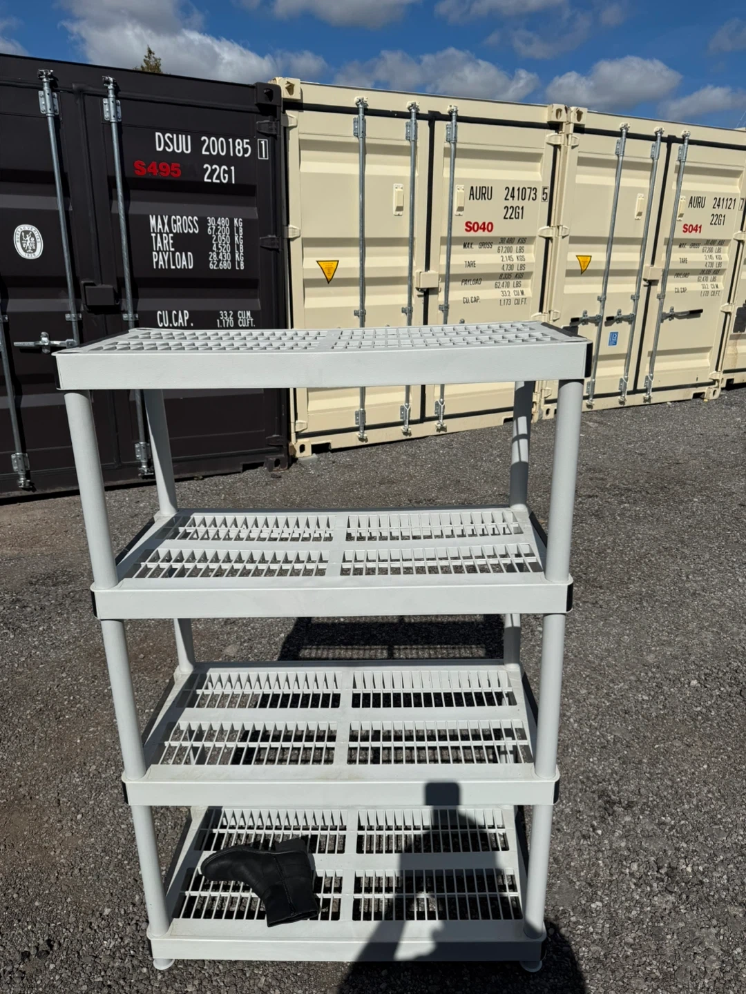 Selling a handy white plastic shelf unit! It's perfect for organizing items in your garage, basement, or anywhere you need some extra storage. It's lightweight and easy to move around, making it super convenient