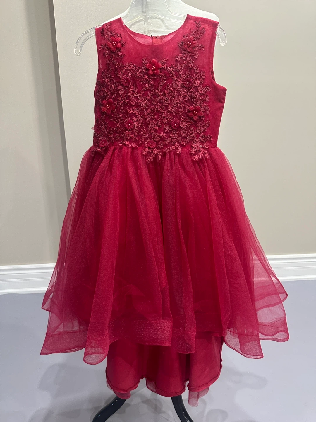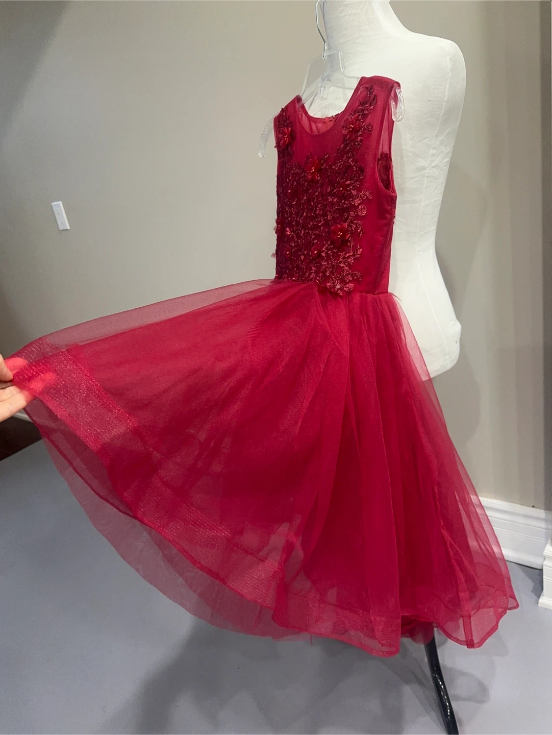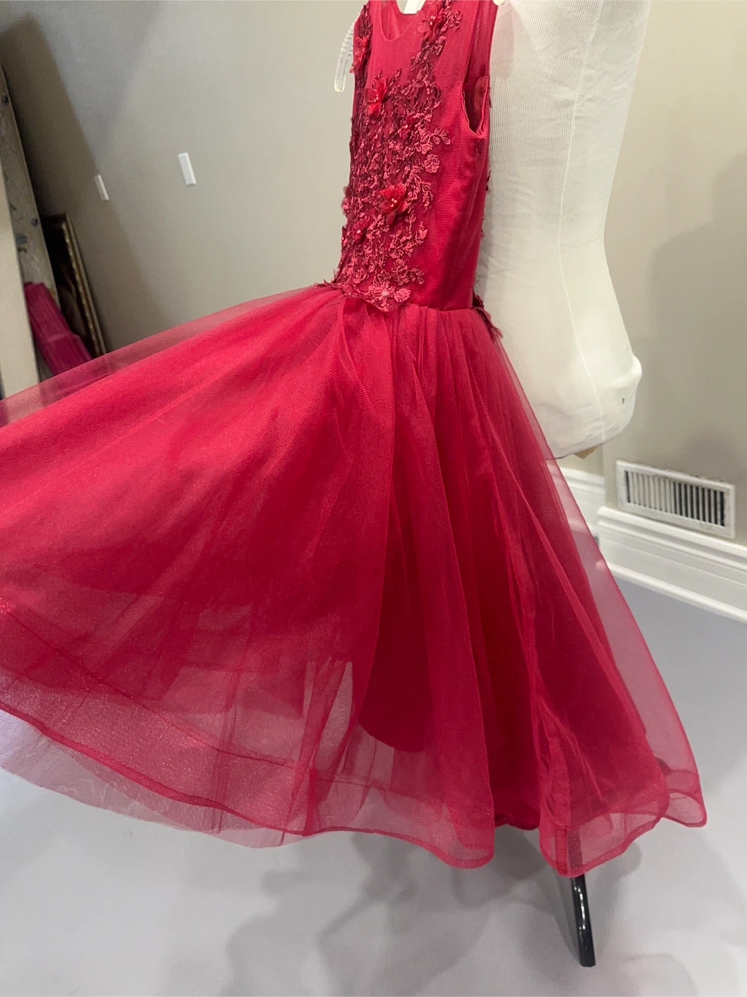 A beautiful red flower girl dress, high quality, many layers ! It features a detailed bodice with floral embellishments and a layered tulle skirt. Perfect for a special occasion or party