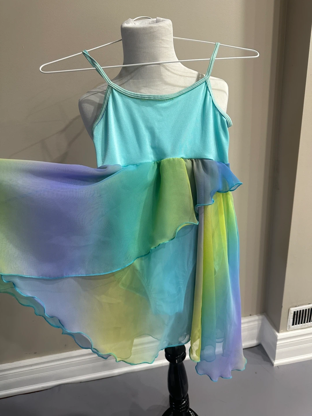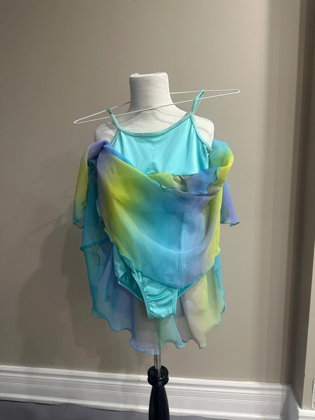 Selling a dance costume featuring a leotard with an attached skirt. The colours are a beautiful mix of blue, green, and yellow. Perfect for dance recitals or performances!