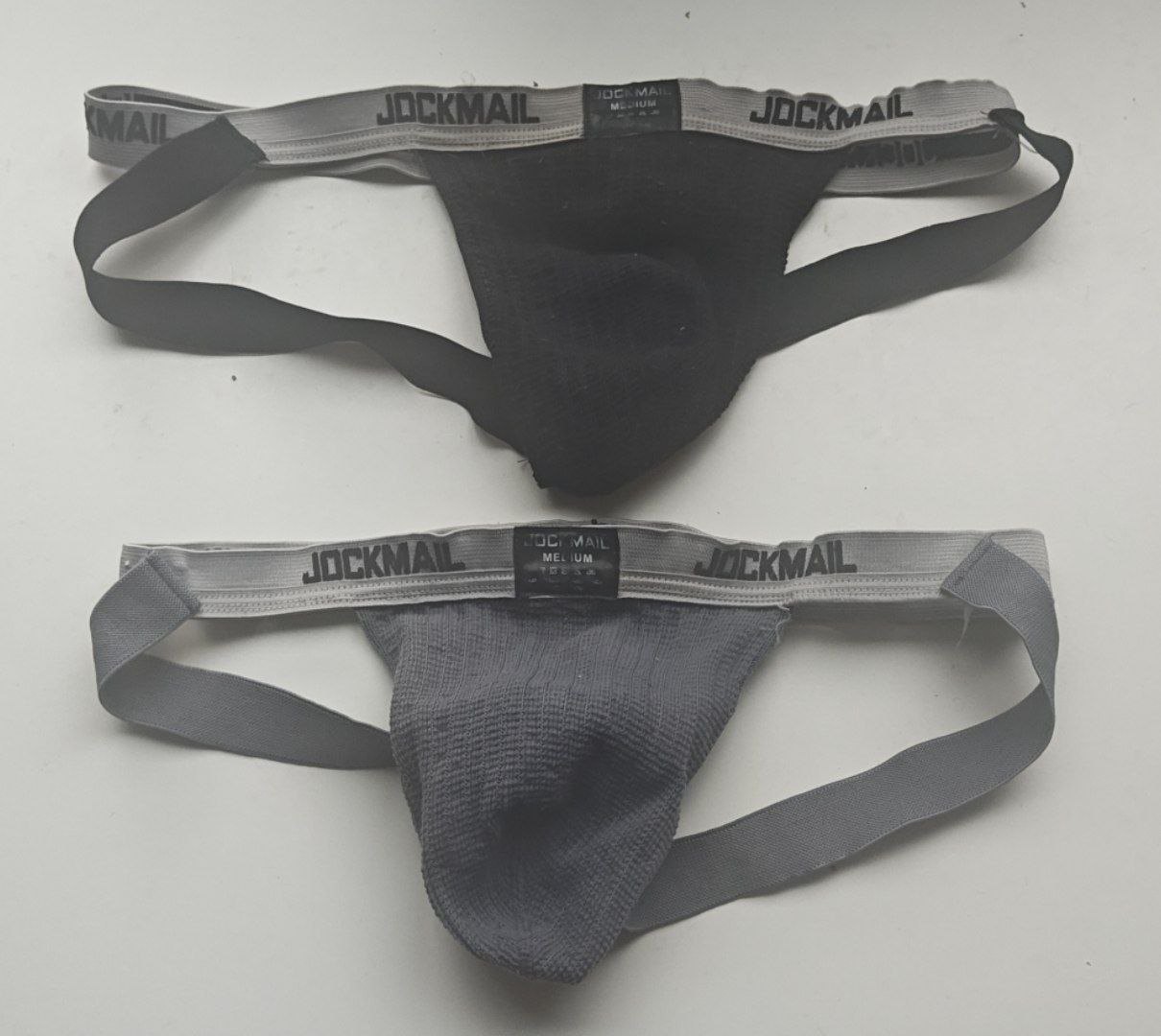 Jockmail athletic jockstraps, size Medium. Comfortable elastic waistband with breathable pouch — great for gym use or sporty wear. Gently used, clean condition.