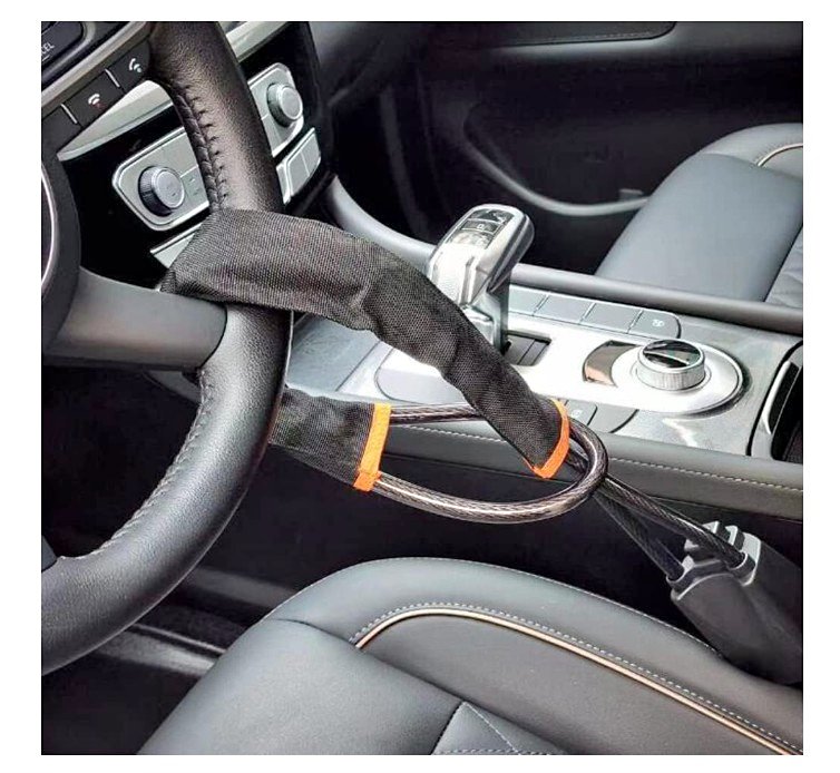 High-quality Tevlaphee Steering Wheel Lock & Seat Belt Lock — designed for maximum vehicle security. This universal anti-theft device fits most cars, SUVs, vans, and trucks, preventing steering movement and deterring theft effectively.