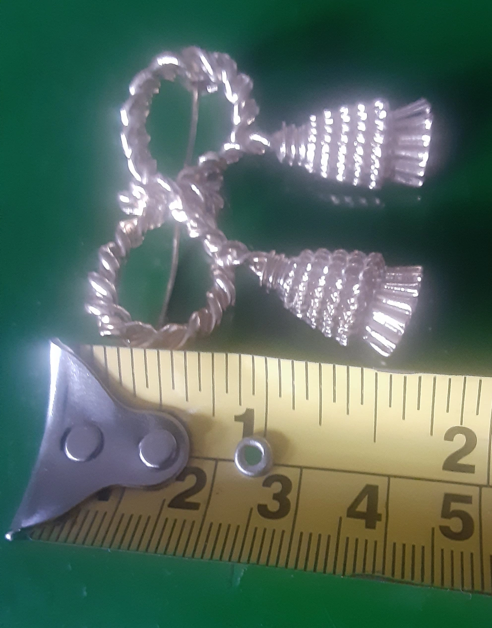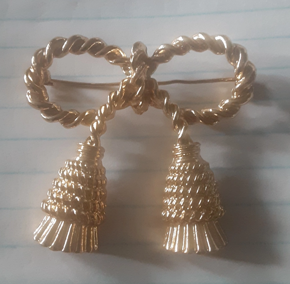 A lovely gold-toned bow brooch with tassel details! It's in great condition. The brooch measures approximately 2 inches in width.