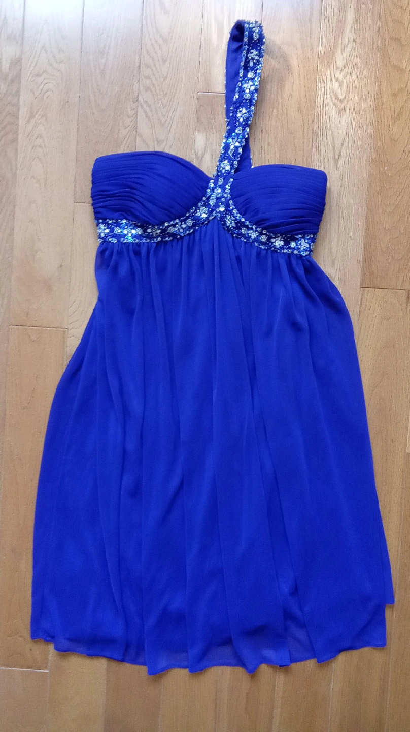 Selling a beautiful blue dress for prom or parties. This dress is a size 2 and features a stylish, one-shoulder design with beaded accents.
