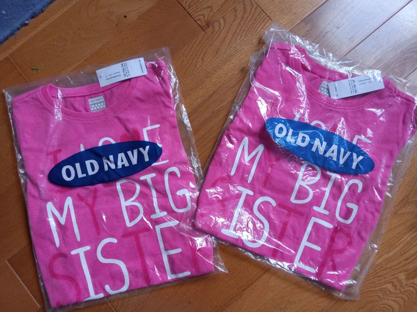 126I have two brand new Old Navy t-shirts, size 4T and 5T. They're pink and say "I Love My Big Sister" in white lettering. Perfect for your little one! $10 each