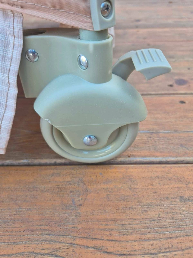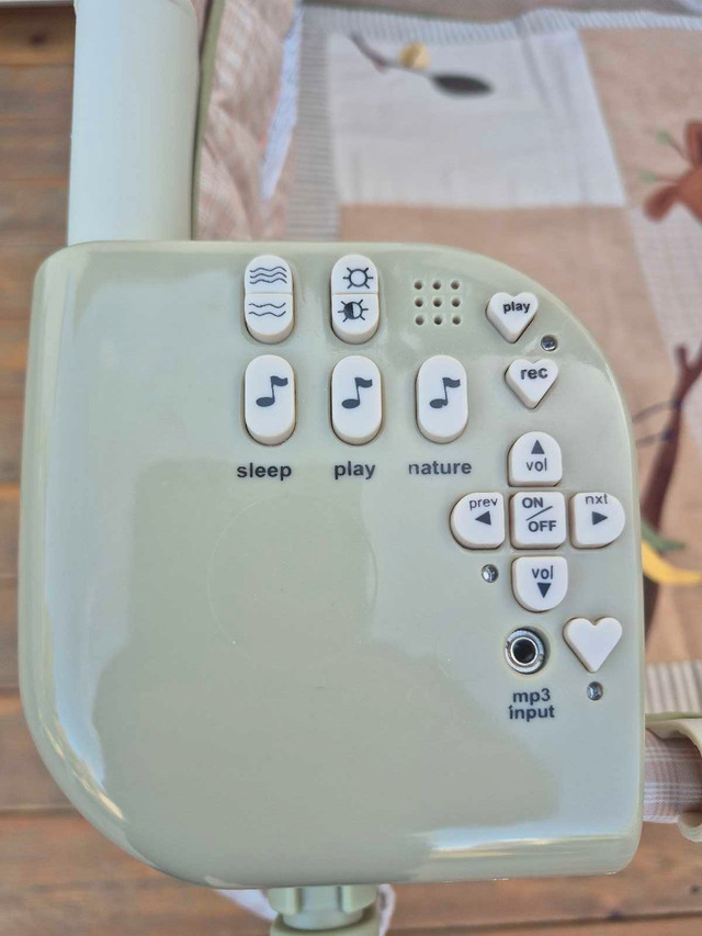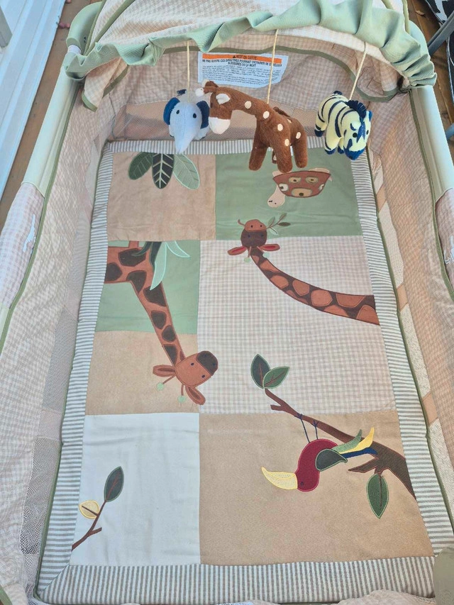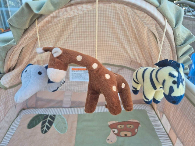 The entire Playpen folds compactly and travels in handy carry bag. All features including the entertainment center with 2 speed vibration, a night light, and music are in working order. Manuals and original packaging are included with the playpen.