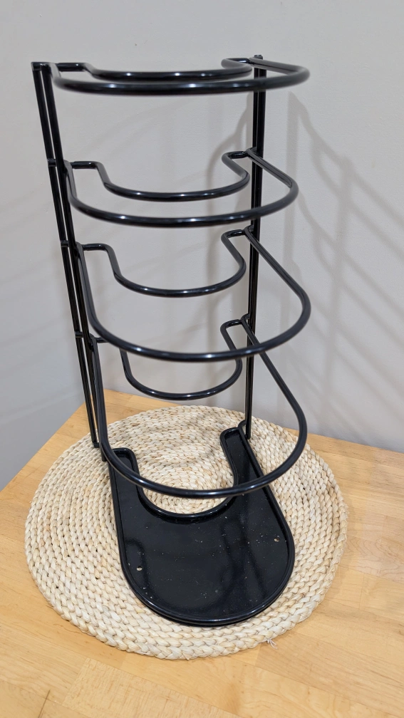 Keep your kitchen organized with this black pot lid organizer rack! It's perfect for storing pot lids and keeping them easily accessible. This rack is in great condition and ready to help declutter your kitchen space