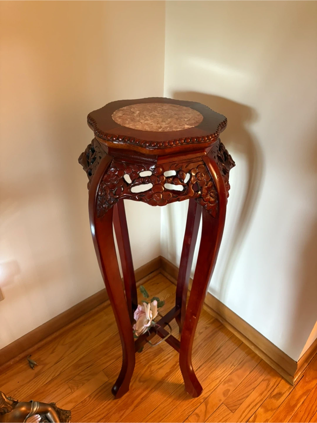 10Beautiful vintage wooden plant stand with a unique marble-like top. The stand features intricate carvings and a rich, dark finish. It's perfect for displaying plants or other decorative items in your home. It’s in great condition and ready to add a touch of elegance to your space