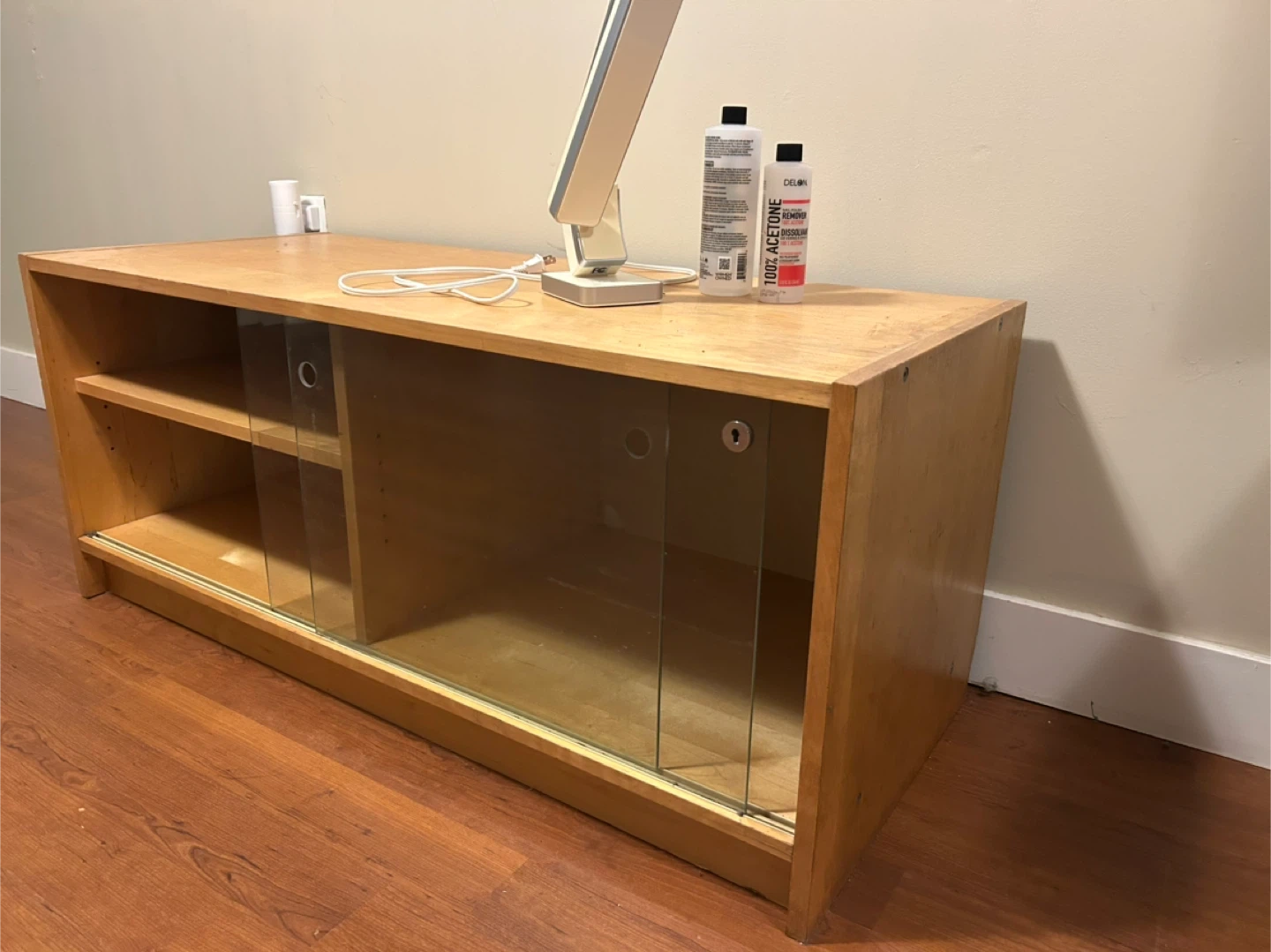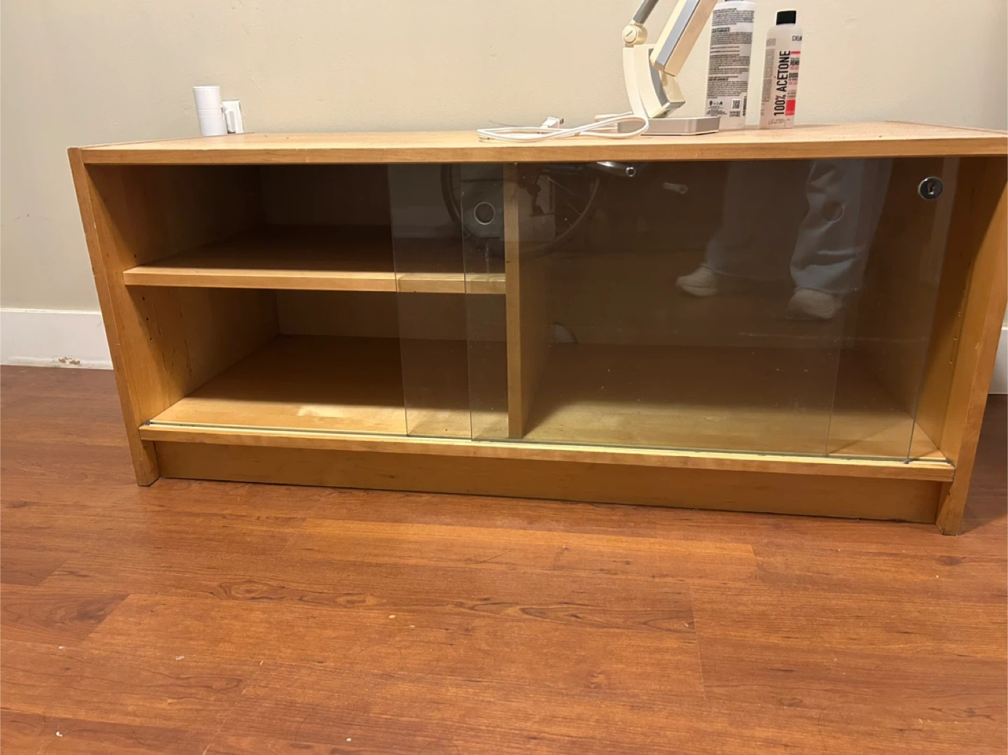 Selling a light wood TV stand or media console. It has sliding glass doors and shelving for storage. Great for a living room or entertainment area!