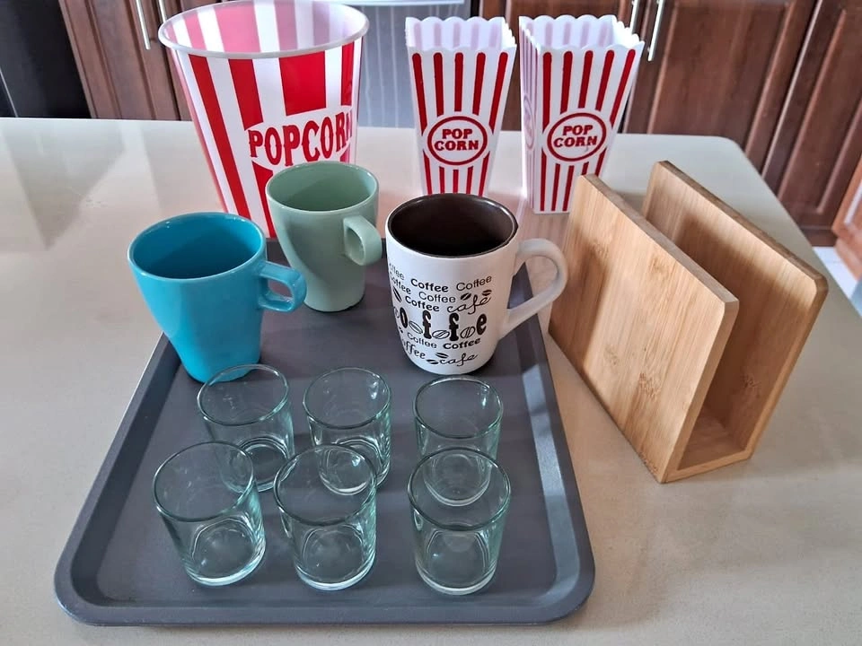86Complete Kitchen & Bar Essentials Bundle – All for just $20! Perfect for home, parties, or gifting. Bundle Includes: 1 Large Popcorn Tub (red & white striped) 2 Small Popcorn Boxes (matching design) 3 Coffee Mugs (assorted styles & colors) 1 Wooden Tissue Holder / Stand 6 Vodka / Shot Glasses (clear glass) 1 Serving Tray (sturdy, non-stick style) Great value set for entertaining guests, organizing your kitchen, or enjoying family movie nights.