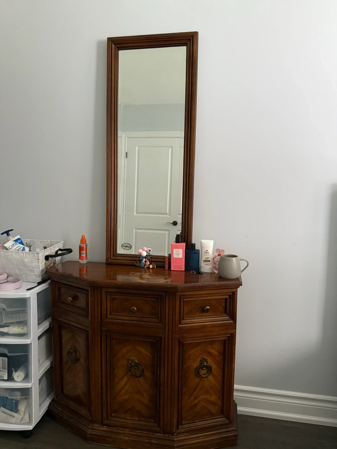 76A lovely wooden vanity table with an attached mirror. It features a rich, dark wood finish and classic design. There are some signs of wear and tear but It would be a great addition to any bedroom or dressing area!