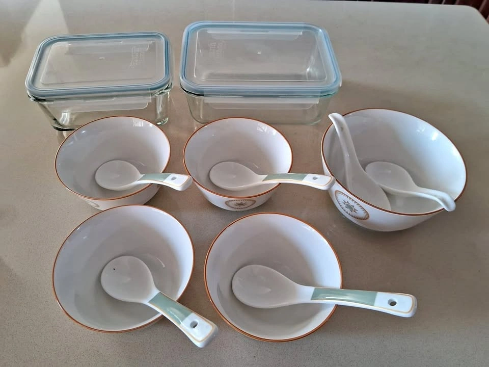 97Selling a complete kitchen bundle, all items are new and unused, for just $25. Perfect for home use or gifting! ✅ 5 ceramic soup bowls – durable and elegant design ✅ 6 soup spoons – matching set for the bowls ✅ 2 airtight glass containers – ideal for storage or meal prep All items are in excellent condition, clean, and ready for use. Great value bundle for your kitchen needs.