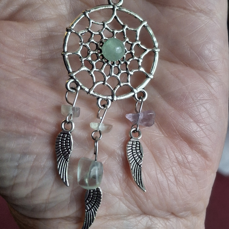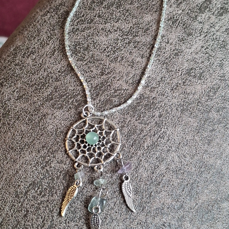 A beautiful silver dream catcher necklace with. It features a delicate web design with adventurine beads and angel wing charms dangling below. A lovely accessory to add a touch of whimsy to any outfit