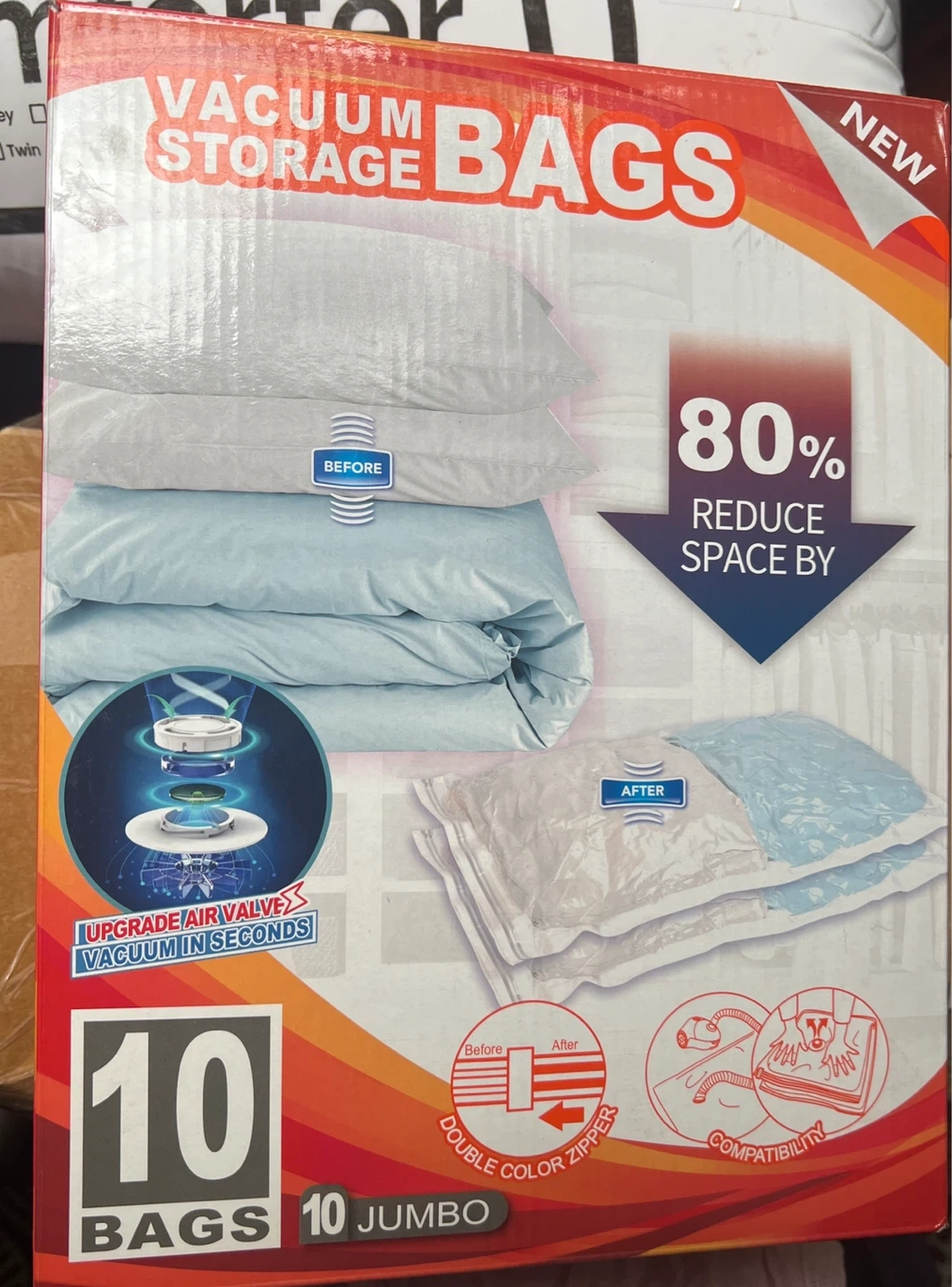 These jumbo vacuum storage bags are perfect for reducing clutter and saving space! They're made with durable material and feature a double zipper for a secure seal. Each bag is reusable and waterproof, making them ideal for storing clothes, quilts, blankets, pillows, and more. This pack includes 10 jumbo bags, each measuring 27 x 39.5 inches