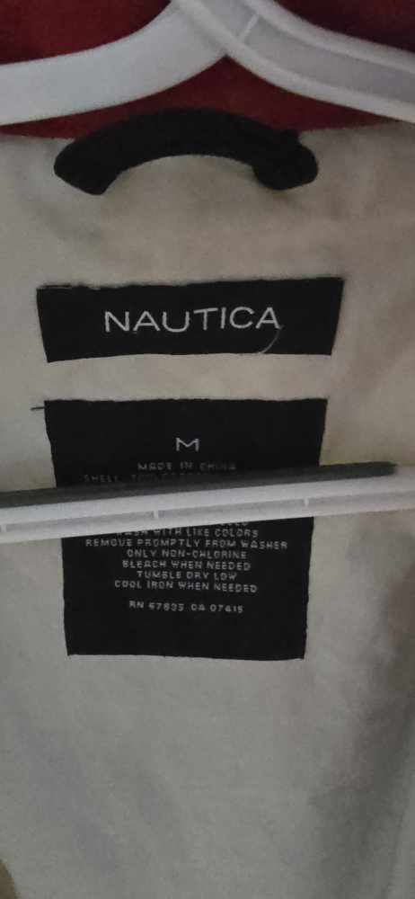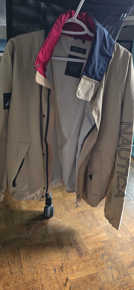 Selling a Nautica jacket in size medium. It's a beige colour with a navy blue and red collar lining. The Nautica logo is printed on the sleeve. It's in great condition and ready for a new home!