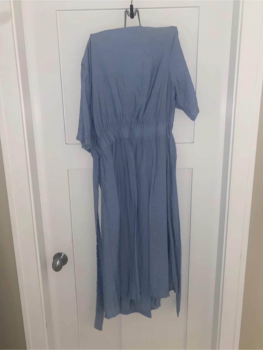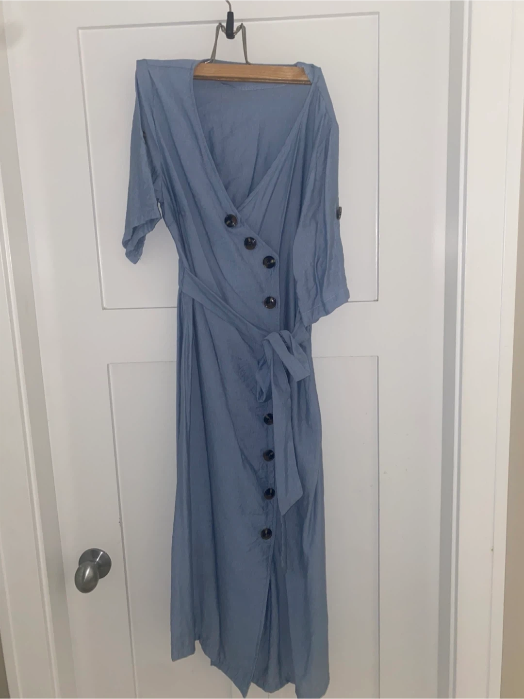 174A lovely blue midi dress featuring a stylish button-down design and a flattering tie at the waist. Perfect for a casual outing or a relaxed day at home! It's in great condition and ready for a new home
