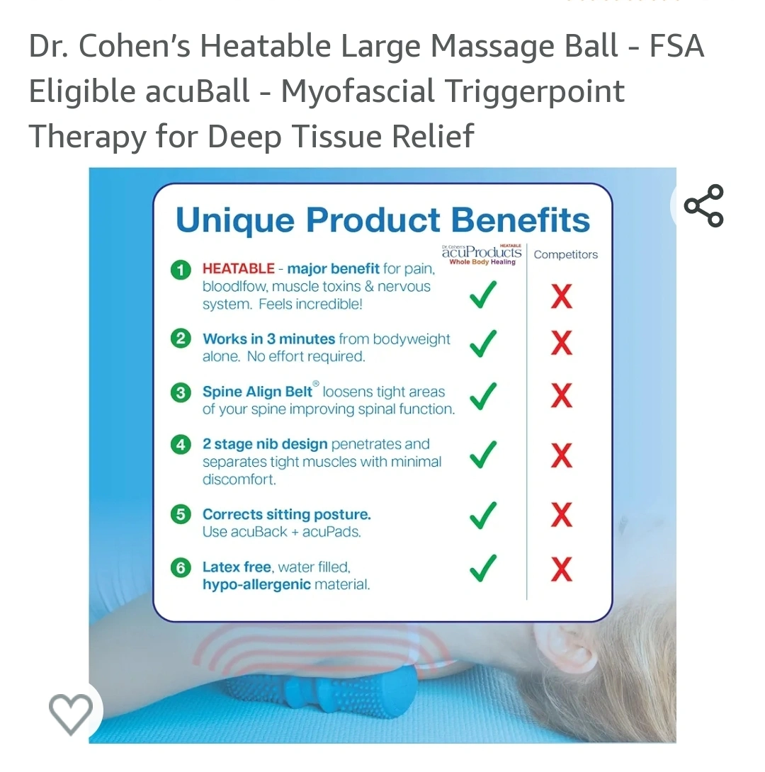 Dr. Cohen's heatable massage ball is perfect for targeting those tight spots in your back, hips, legs, and shoulders. It's designed to improve posture, productivity, and help you de-stress. Provides effective pain relief anytime!