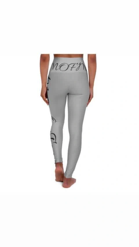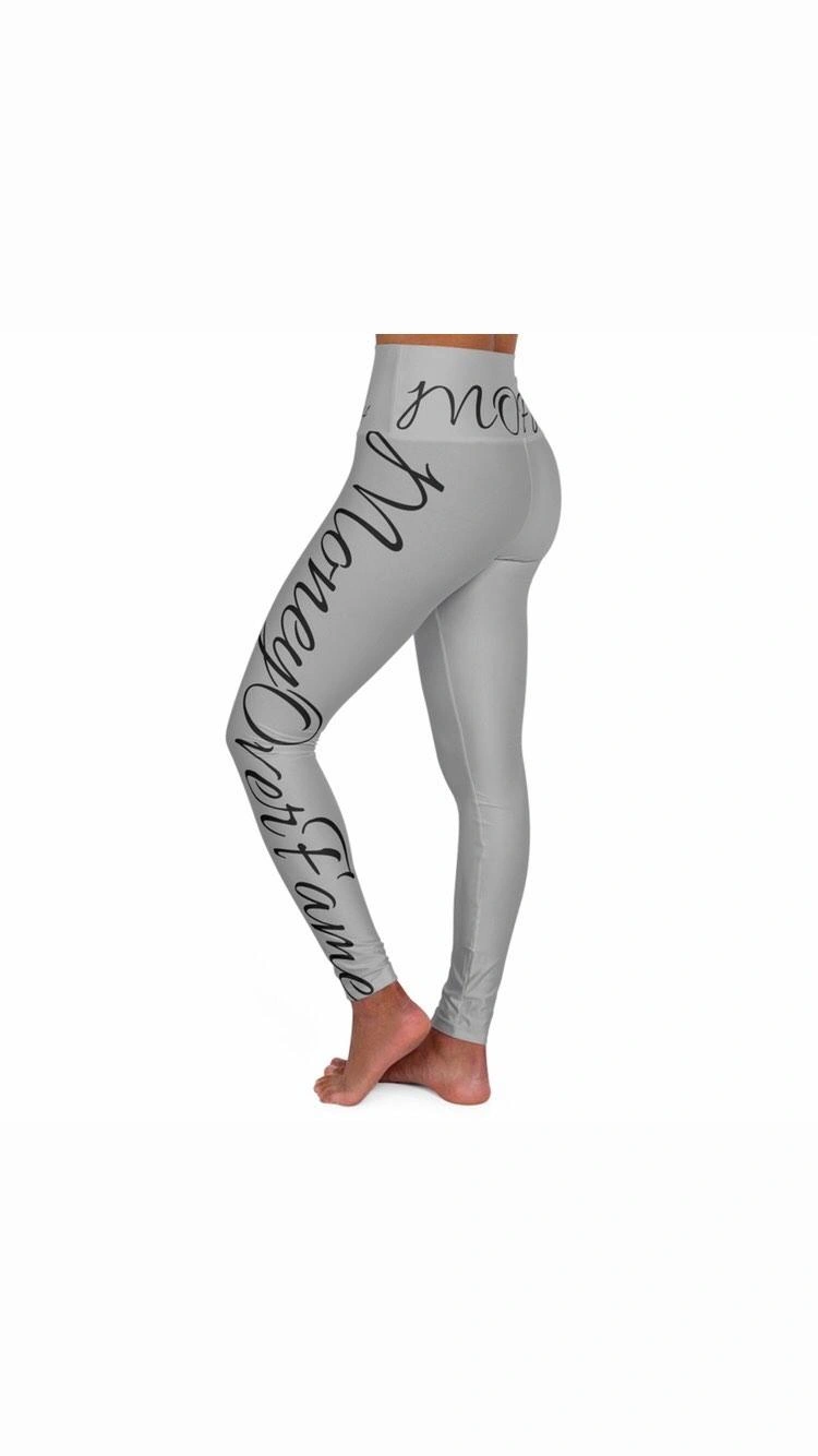 Grey leggings with 'Money Over Fame' design. Perfect for workouts or casual wear!