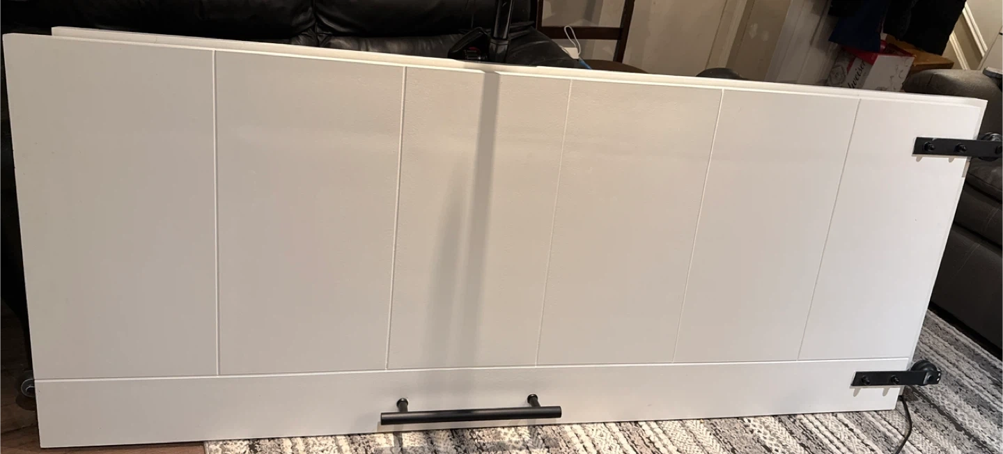 Selling 2 white sliding barn doors in brand new condition. They feature black hardware and a sleek, modern design that would look great in any space!