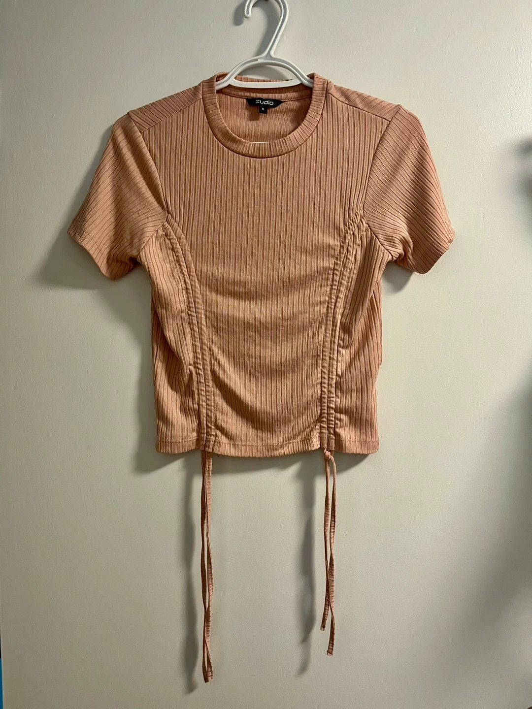 Selling a cute Zudio Studio ribbed top in size M. It features a unique design with drawstring details. Perfect for a casual and stylish look! Pickup downtown and Cash Only!