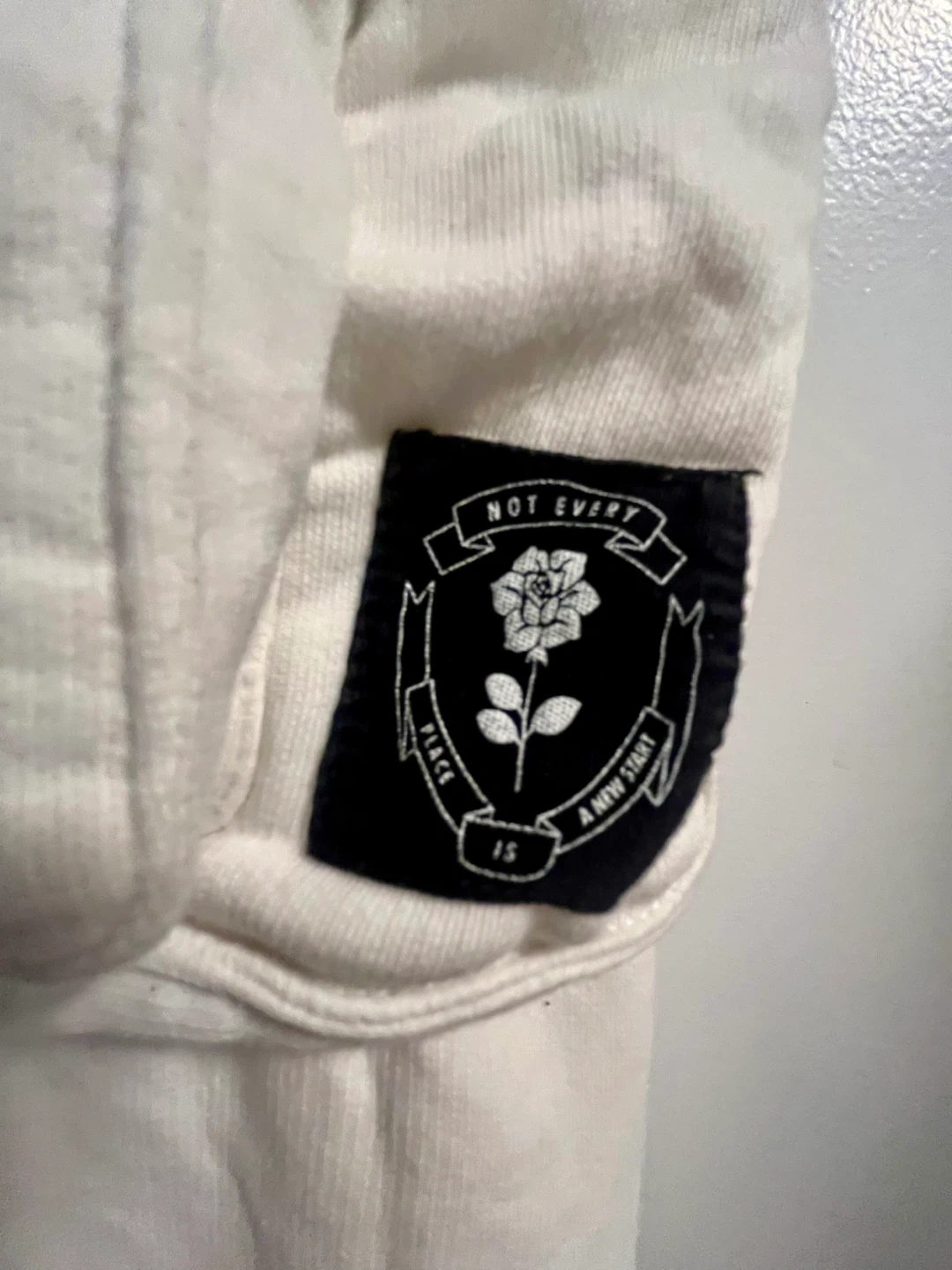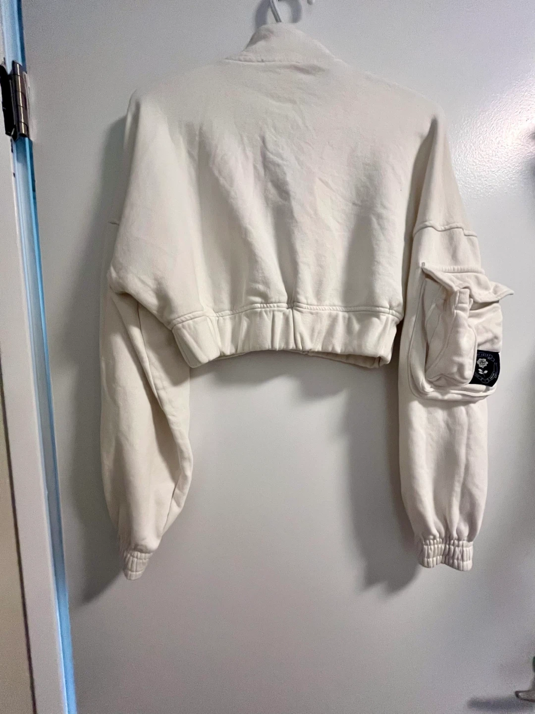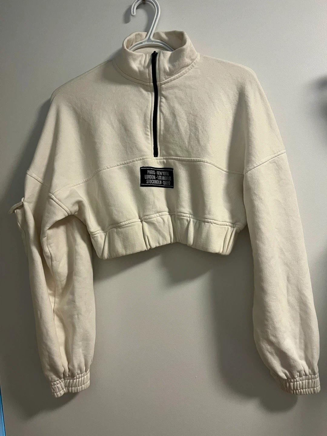 Selling a Bershka cropped pullover in a lovely off-white colour. It's in great condition and features a cool pocket detail on the sleeve. The size is USAS/MEX26/EURS. Perfect for layering or wearing on its own!