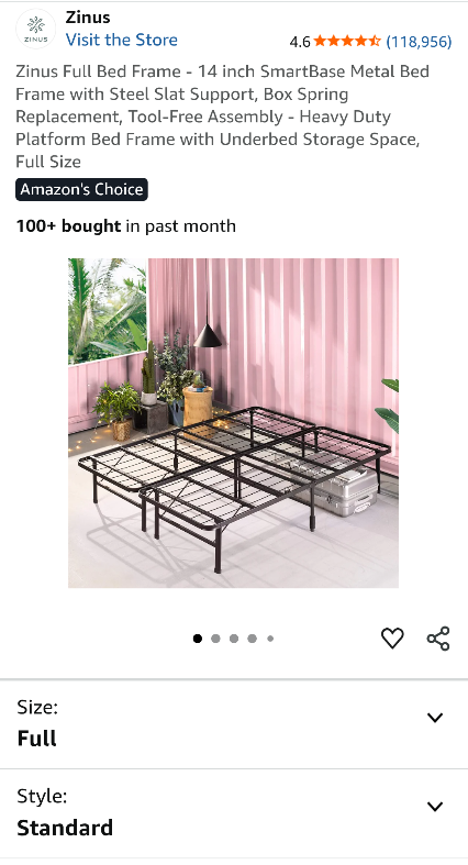 Zinus full-size bed frame box spring replacement with Steel Slat Support. 14 inch SmartBase foldable metal frame. Heavy duty platform with 13 inch underbed storage space. Tool-free assembly Priced at less than 50% off the Amazon price.