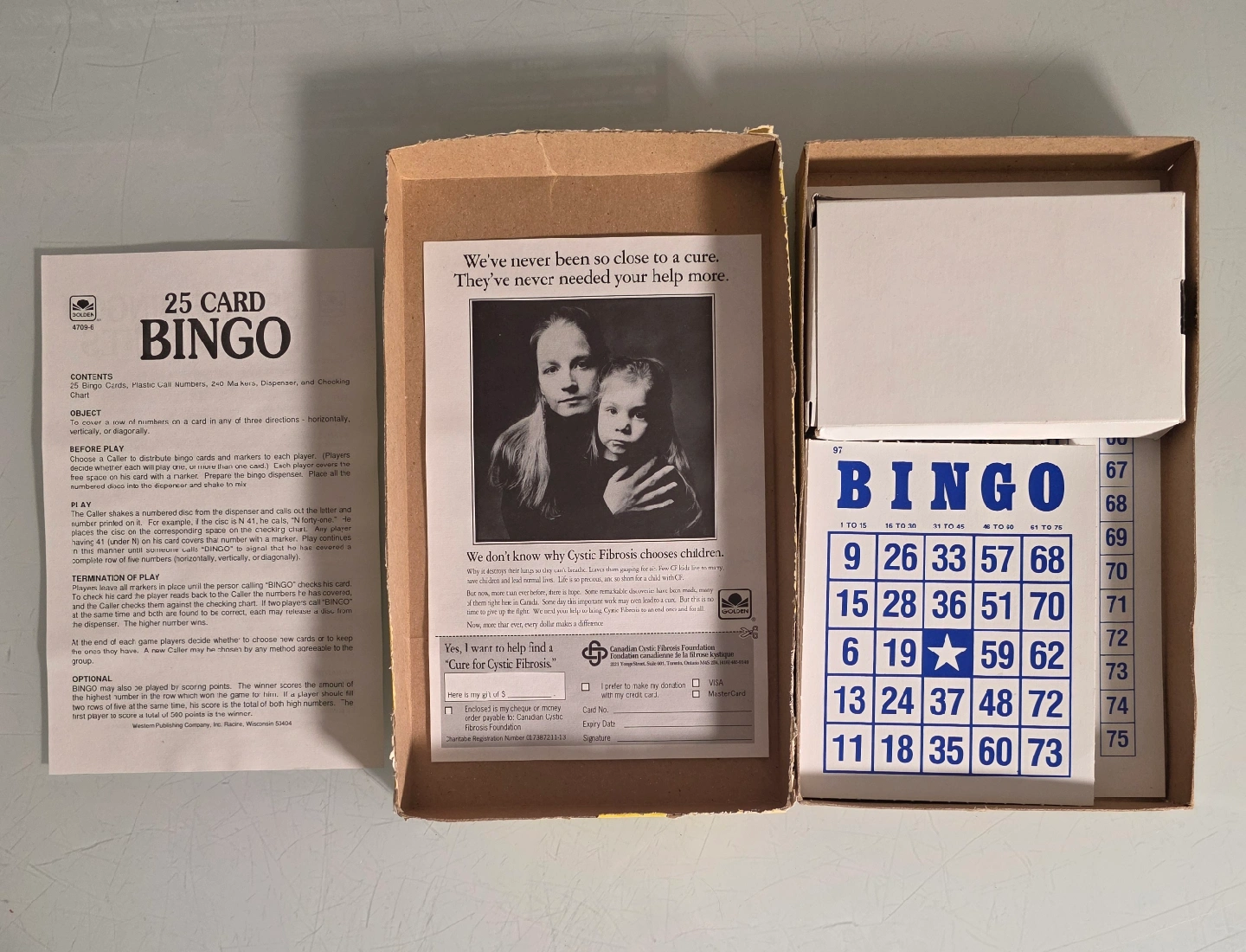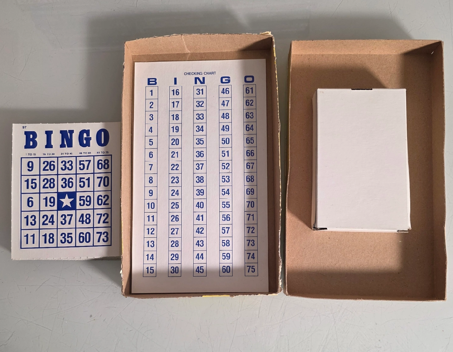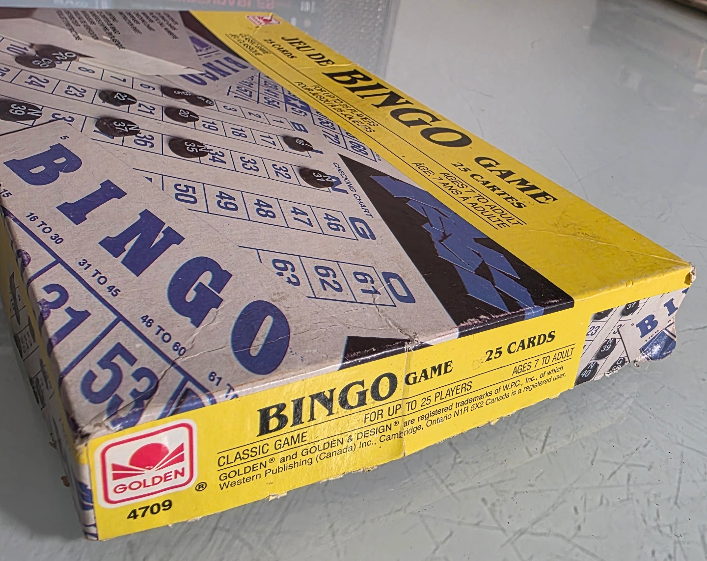 Selling a complete vintage Golden Bingo game. Includes 25 bingo cards, plastic call numbers, markers, checking chart, dispenser, and instruction sheet. A classic game for up to 25 players, ages 7 to adult. Great condition. Completely unused.